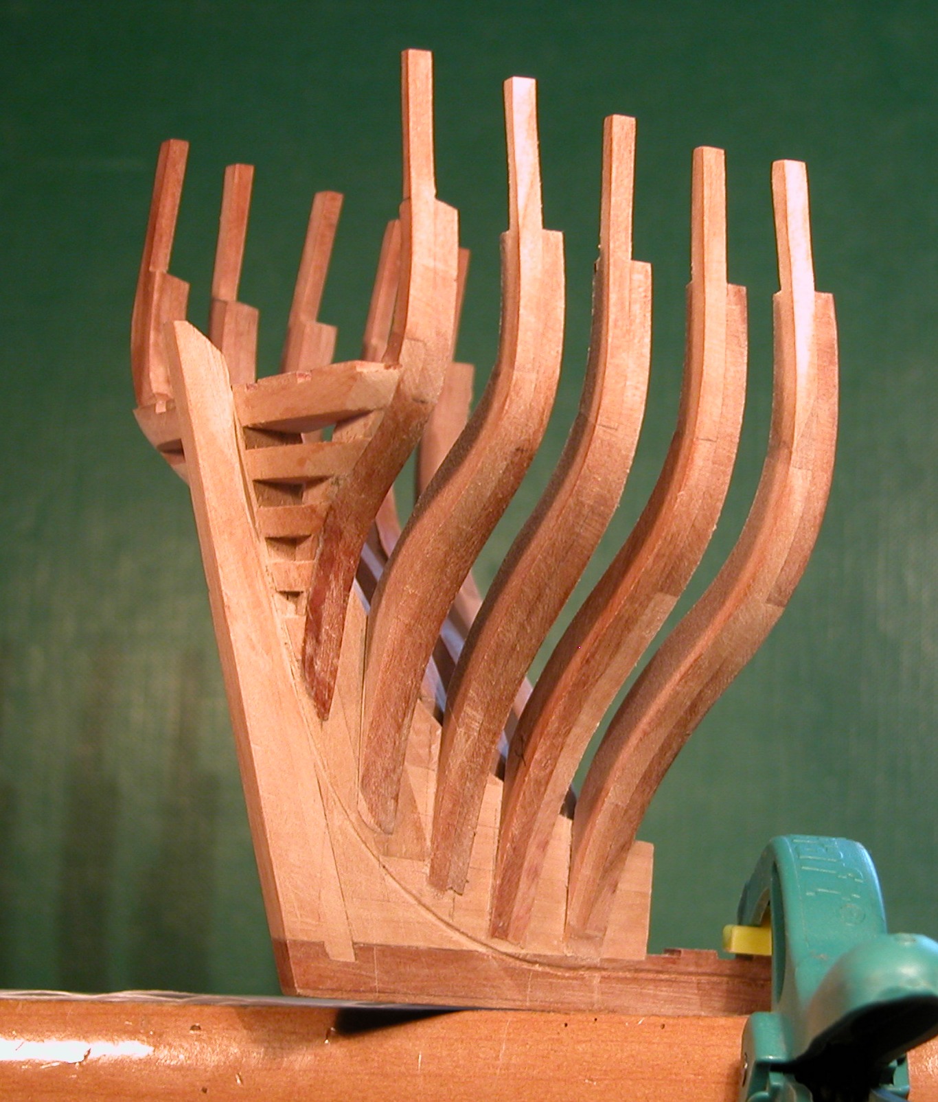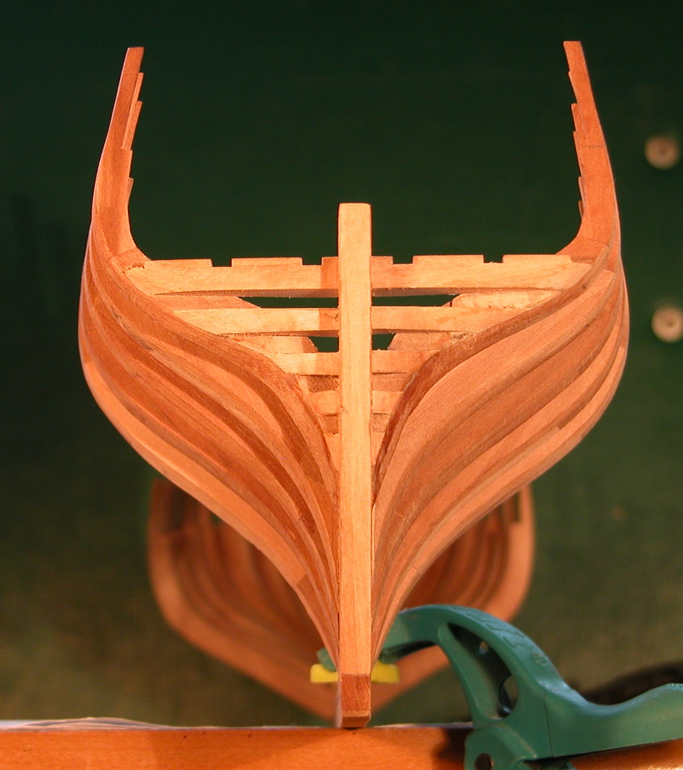 Na sterburcie jest dobrze, więc to nie wina planów tylko moja – musiałem zbyt mocno „wychapać” tę wręgę przy szlifowaniu. Różnica w głębokości (odległość od planek) nie jest bardzo duża (ok. 0,5 mm), ale na pewno nie można jej zniwelować przez zeszlifowanie sąsiednich wręg. Lenistwo mi podpowiada, żeby zamiast wymieniać całą wręgę zrobić „doklejkę” na długości ok. 1 cm (w końcu to tylko model treningowy). Z drugiej strony staramy się pracować najlepiej jak potrafimy. Muszę to przemyśleć.