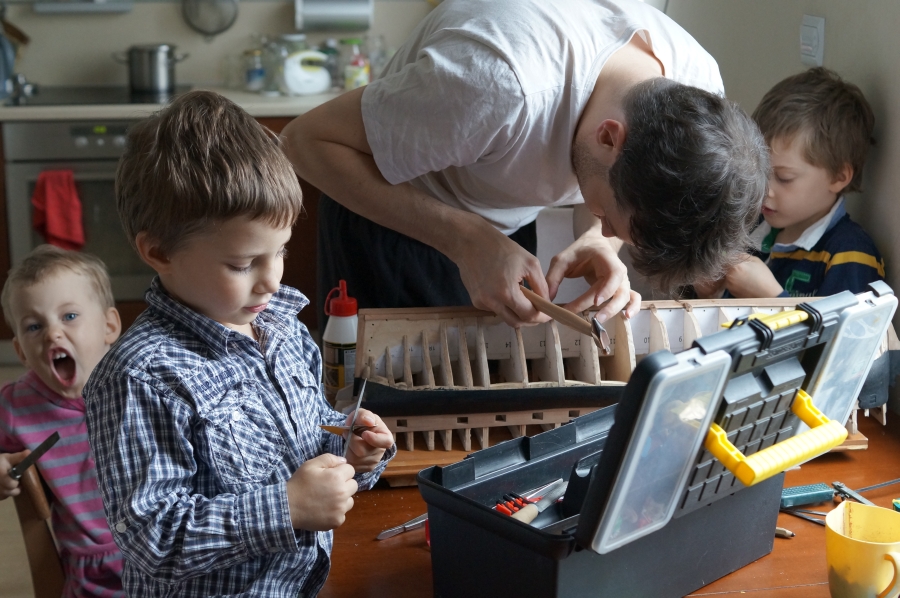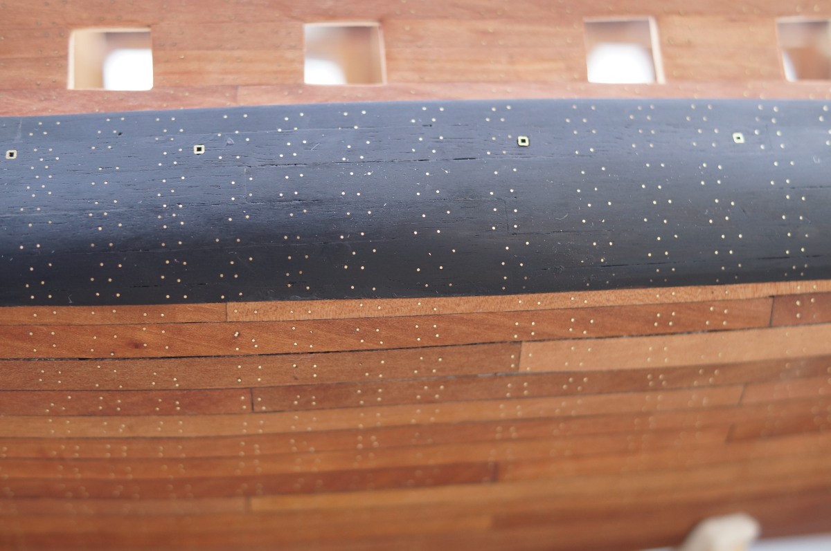 Witam. Po rocznej przerwie zw. z narodzinami kolejnego bobasa, jakiś czas temu wznowiłem pracę nad statkiem. Na pierwszy ogień poszło skończenie poszycia i przybicie wszystkich gwoździ w poszyciu. Uff...