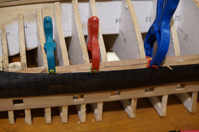 Powolutku... Musiałem porobić trochę korekt na wręgach, a kilka niestety wyciąć powyżej głównego pokładu. Powklejałem klocki na linii wody, gdzie będzie zmiana gatunku drewna, oraz na rufie. No i pierwsze planki wyznaczające z grubsza przebieg furt działowych.
