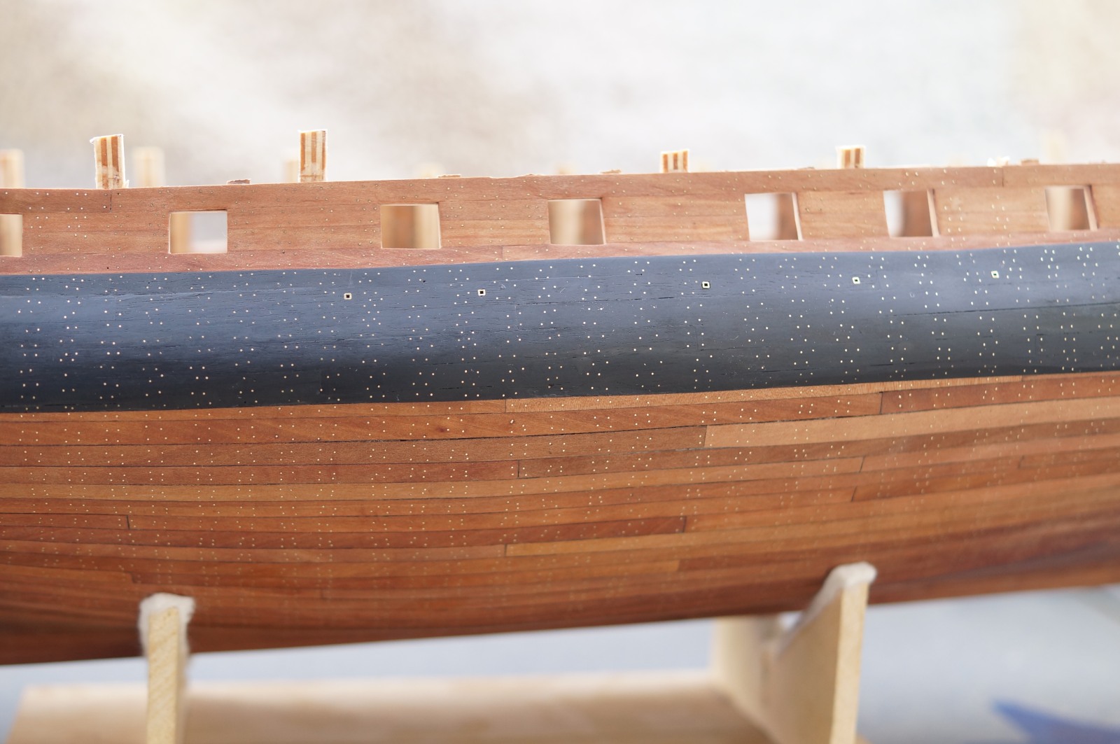 Powolutku... Musiałem porobić trochę korekt na wręgach, a kilka niestety wyciąć powyżej głównego pokładu. Powklejałem klocki na linii wody, gdzie będzie zmiana gatunku drewna, oraz na rufie. No i pierwsze planki wyznaczające z grubsza przebieg furt działowych.