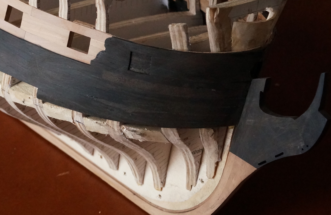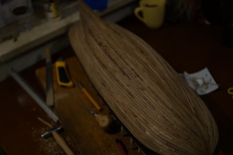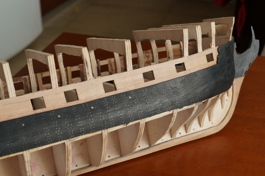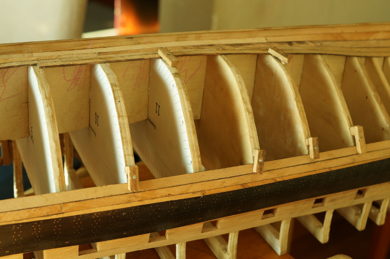 Powolutku... Musiałem porobić trochę korekt na wręgach, a kilka niestety wyciąć powyżej głównego pokładu. Powklejałem klocki na linii wody, gdzie będzie zmiana gatunku drewna, oraz na rufie. No i pierwsze planki wyznaczające z grubsza przebieg furt działowych.