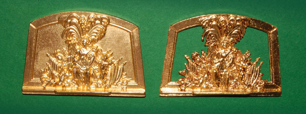 Metalowy odlew, mosiądzowany (efekt złocenia), idzie po łuku (nie płaski), dość głęboko płaskorzeźbiony.