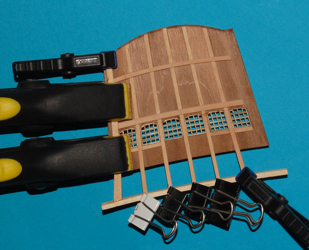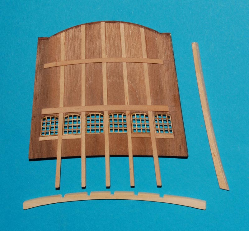 Po drugiej stronie "pawęży" powstaje imitacja ożebrowania pawęży (wzorowana z planu), to po to, aby uzyskać okna kajut oficerskich.