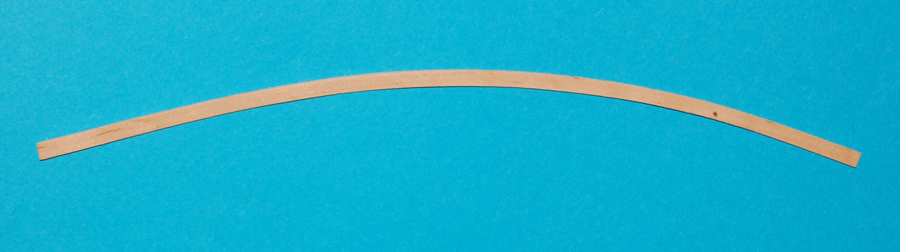 Teraz wziąłem na tapetę okna. Otwory okienne mają mniej więcej wymiar 10 x 11 mm i jak widać pochylają się, więc każde trzeba będzie traktować indywidualnie. Do tego górna krawędź otworu jest profilowana, więc i okno będzie miało taki profil, który uzyskałem klejąc cienki pasek (szer. 0,8 mm) z forniru (0,5 mm). Kolejne paski będą ramiakiem okna.