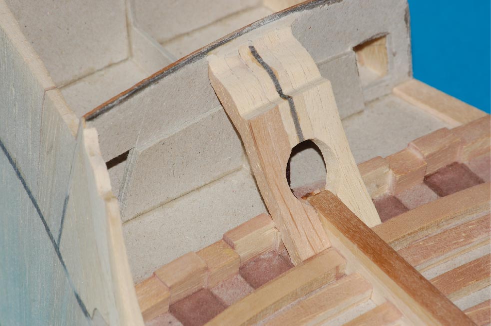 Kolejnym elementem będzie profilowany nawis pawęży. Upraszczając (na wzór kolekcji zeszytowych) mógłbym wkleić cztery profilowane trójkąty, ale więcej frajdy będzie jeśli zrobię to z belek (wg planów p. Boudriota). Zaczynam od środkowych z otworem na ster.
