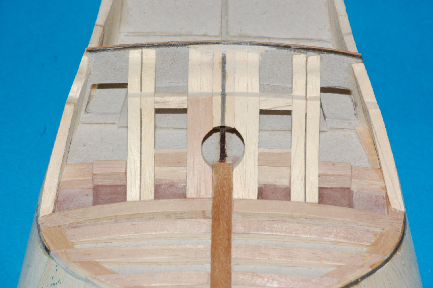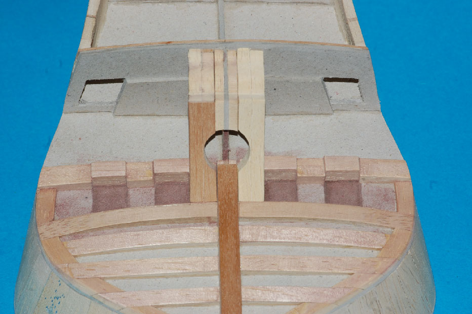 Nakleiłem listewki imitujące stewę rufową i kil. Przygotowałem belki nad ambrazurami (z planu) i wzmocnienie konstrukcyjne
