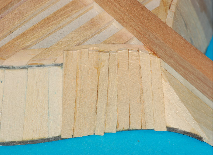 a pod deskowanie pawęży lite klepki miękkiego drewna (balsa, wawa, lipa), które doszlifujemy do odpowiedniego kształtu.