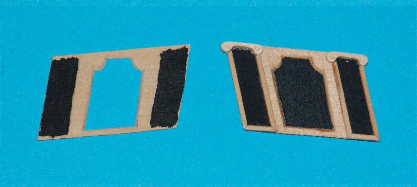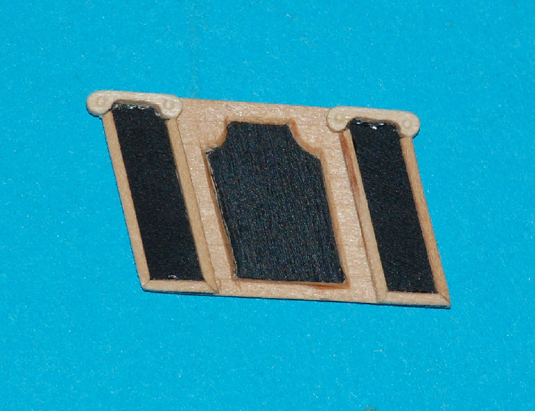 Ścianki robię z trzech warstw. W środkowej otwór podklejony czarną płyciną, a po bokach ramki tworzące pilastry, zwieńczone "wolutami".