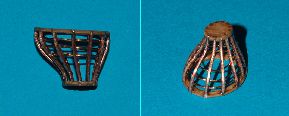 Następnie z drutu miedzianego przystąpiłem do wykonania szkieletu kosza latarni. Miało być prosto - owalna obręcz u góry, mniejsza na dole i przylutowane pomiędzy ukształtowane piony (12 grubszych i 12 cieńszych). Poległem przy tym lutowaniu i dałem za wygraną przy 11 druciku - tu nie będę wchodził w szczegóły, dodam tylko, że pewnie w tym wypadku sprawdziłoby się urządzenie do zgrzewania drutu, na które zwrócił uwagę Tomek Aleksiński, a wykonał je z powodzeniem RomekS.