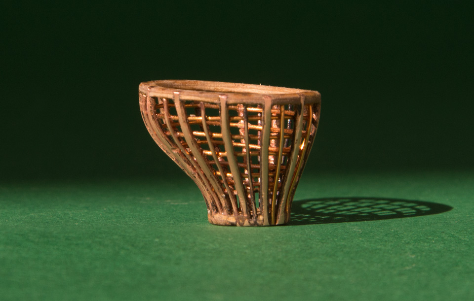 Następnie w podstawie i górnej obręczy wywierciłem kolejne otworki na środkowe elementy kratownicy z cieńszego drutu. W poziomych obręczach frezikiem naciąłem rowki i w poszczególne moduły wkleiłem druciki środkowych elementów kratownic. Po odcięciu i wyszlifowaniu nadałem końcowy kształt podstawie i górnej obręczy. Uzyskałem pierwszy element latarni KOSZ.
