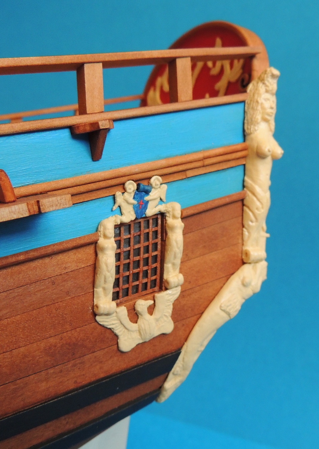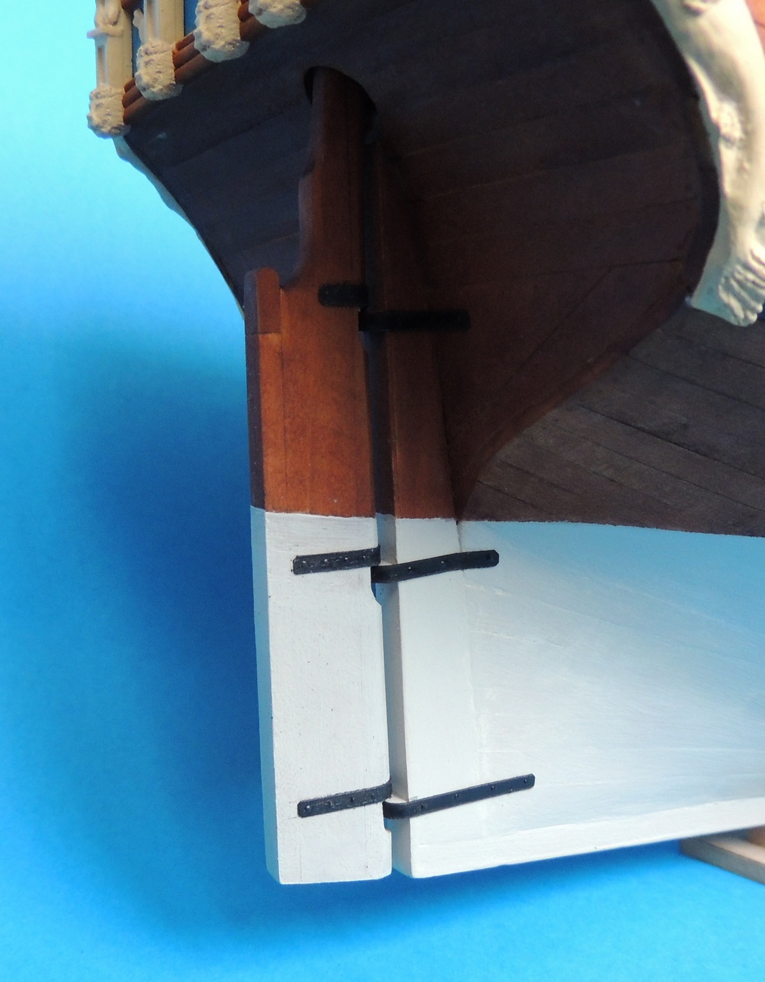Okucia do uprzęży armat zrobione.Zamontowane bezklejowo. W razie czego można wyjąć.Udało się też wystrugać ster. Trzeba go było troszkę skorygować, gdyż stewa rufowa i otwór w pokładzie nie wyszły w jednej osi :?