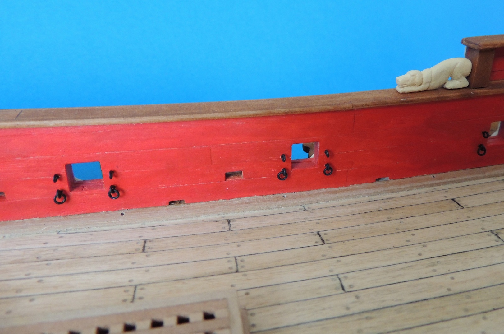 Dzisiaj sobie wydłubałem przegapione otwory wylewowe. Na pokładzie, przy nadburciu, też są otwory, ale już tego nie fotografowałem. Drugi drobiazg to obicie blachą nadburcia. Na obiciu tym, najpewniej spoczywał pazur kotwicy.