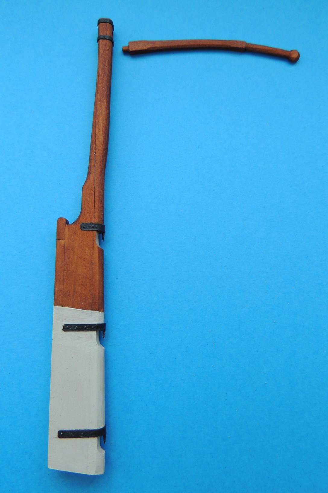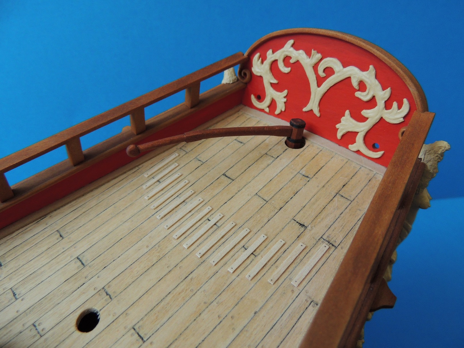Okucia do uprzęży armat zrobione.Zamontowane bezklejowo. W razie czego można wyjąć.Udało się też wystrugać ster. Trzeba go było troszkę skorygować, gdyż stewa rufowa i otwór w pokładzie nie wyszły w jednej osi :?