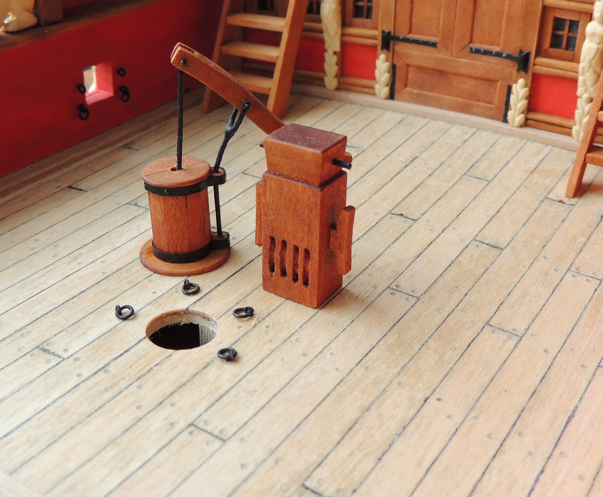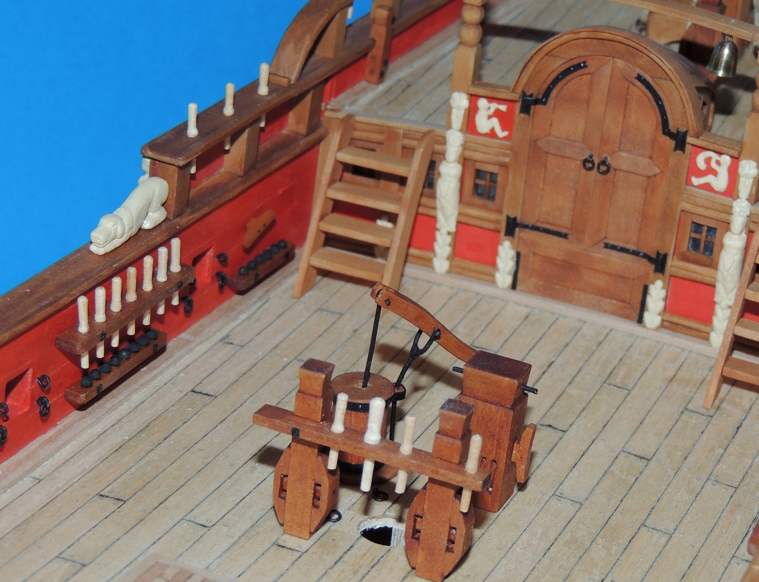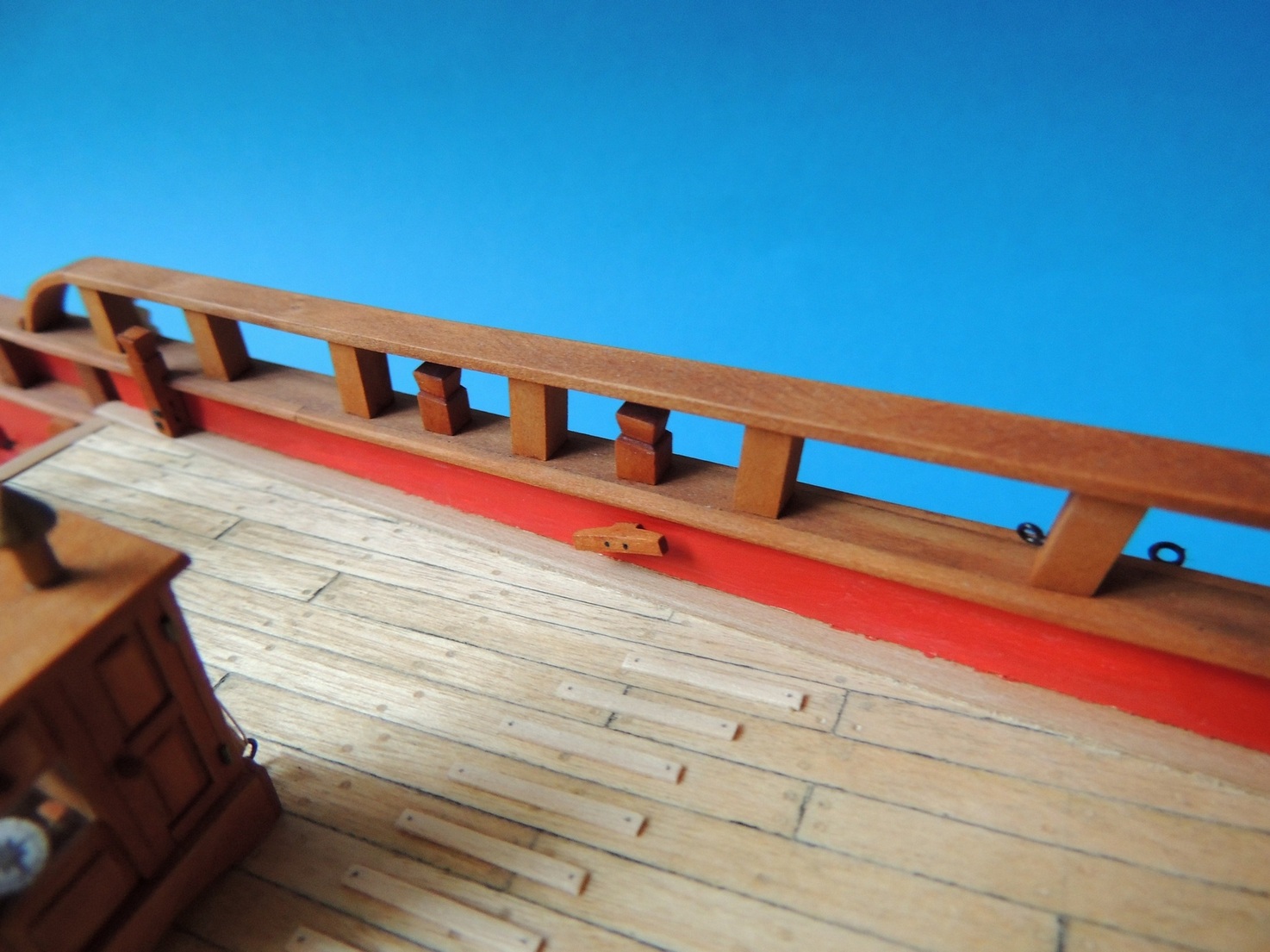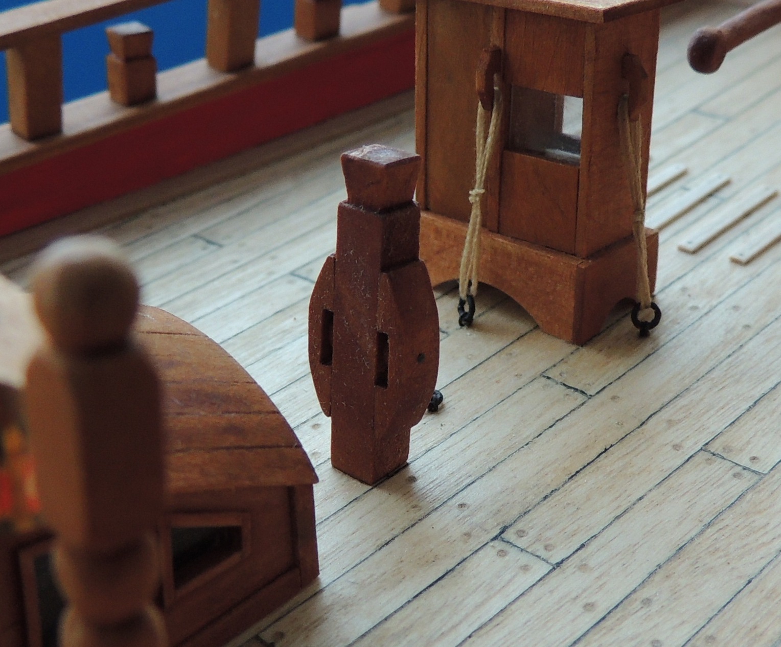 Jedziemy z tematem dalej.Przybyły kilka pachołków na burtach i kilka okuć na pokładach. Teraz pracuję nad pachołkami przymasztowymi. Ten główny przy grotmaszcie już gotowy tylko ta imitacja rolek trochę słaba, ale jakoś nigdy ładnie mi to nie wychodziło.