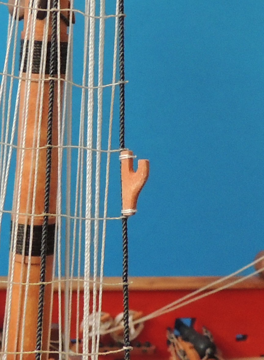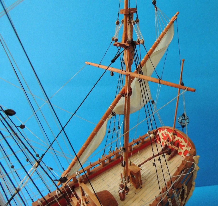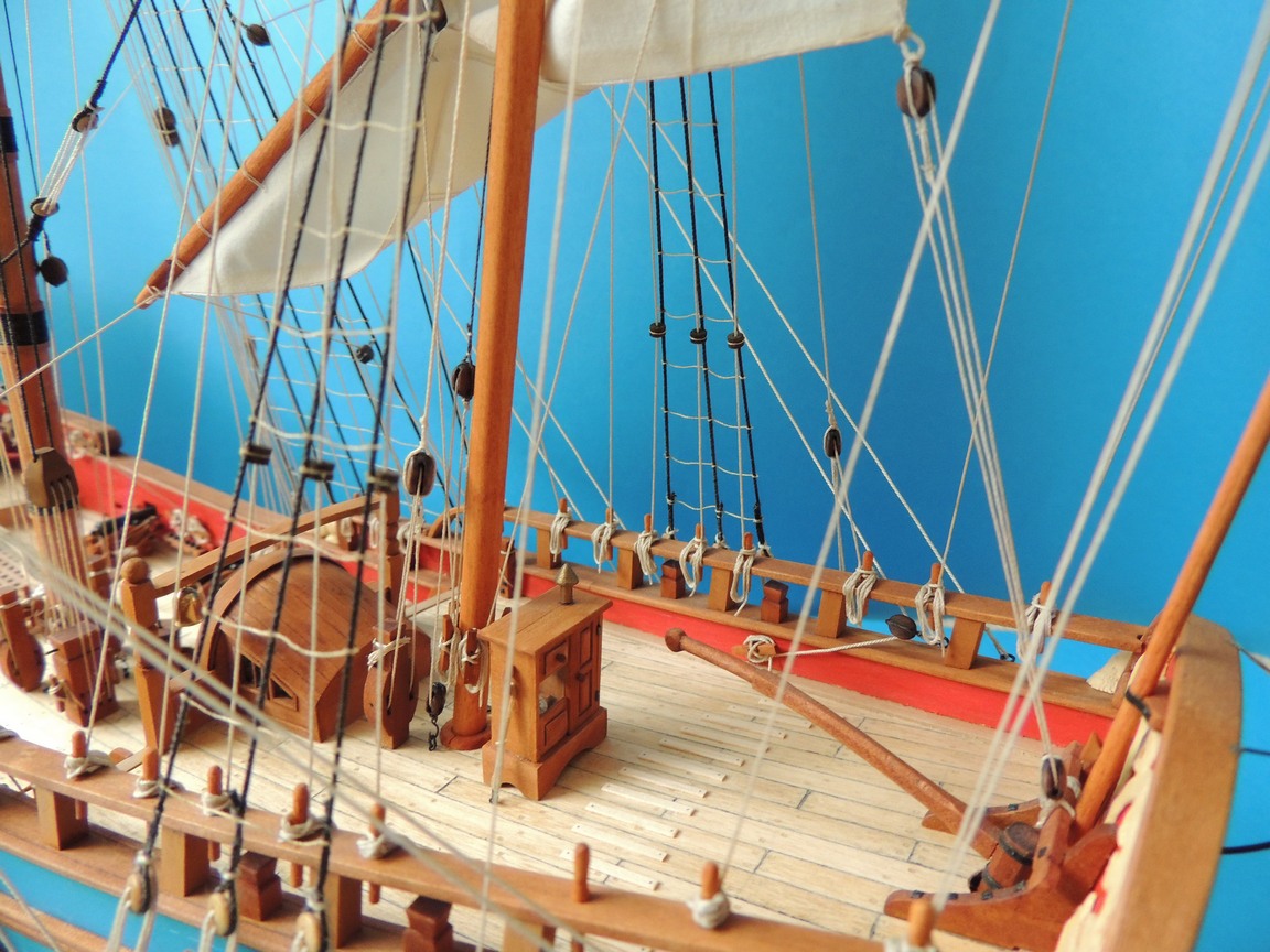 Ostatni żagiel zawieszony. Brasy też. Olinowanie gotowe :D Doszedł jeszcze taki mały drobiazg na wancie,widoczny na ostatnim zdjęciu. Nie wiem do czego służył, ale na replice jest, więc i ja go wykonałem.