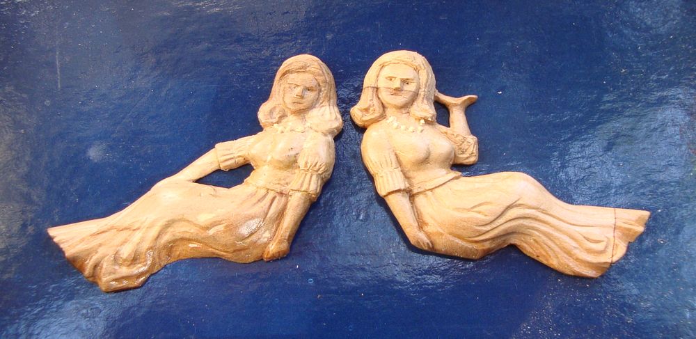 Teraz rzeźby rufowe .Nie jest łatwo .Zacząłem od bukszpanu ale okazał się zbyt twardy i łupliwy .Dobry na małe płaskorzeźby .Doskonale oddaje kształt i daje ostre krawędzie .Znalazłem kawałek jabłoni dobrze się obrabia ale trochę ciągliwy .Jakoś dojechałem do końca .Jeszcze będzie sporo poprawek i korekt .Zagruntowane mocno Caponem .R