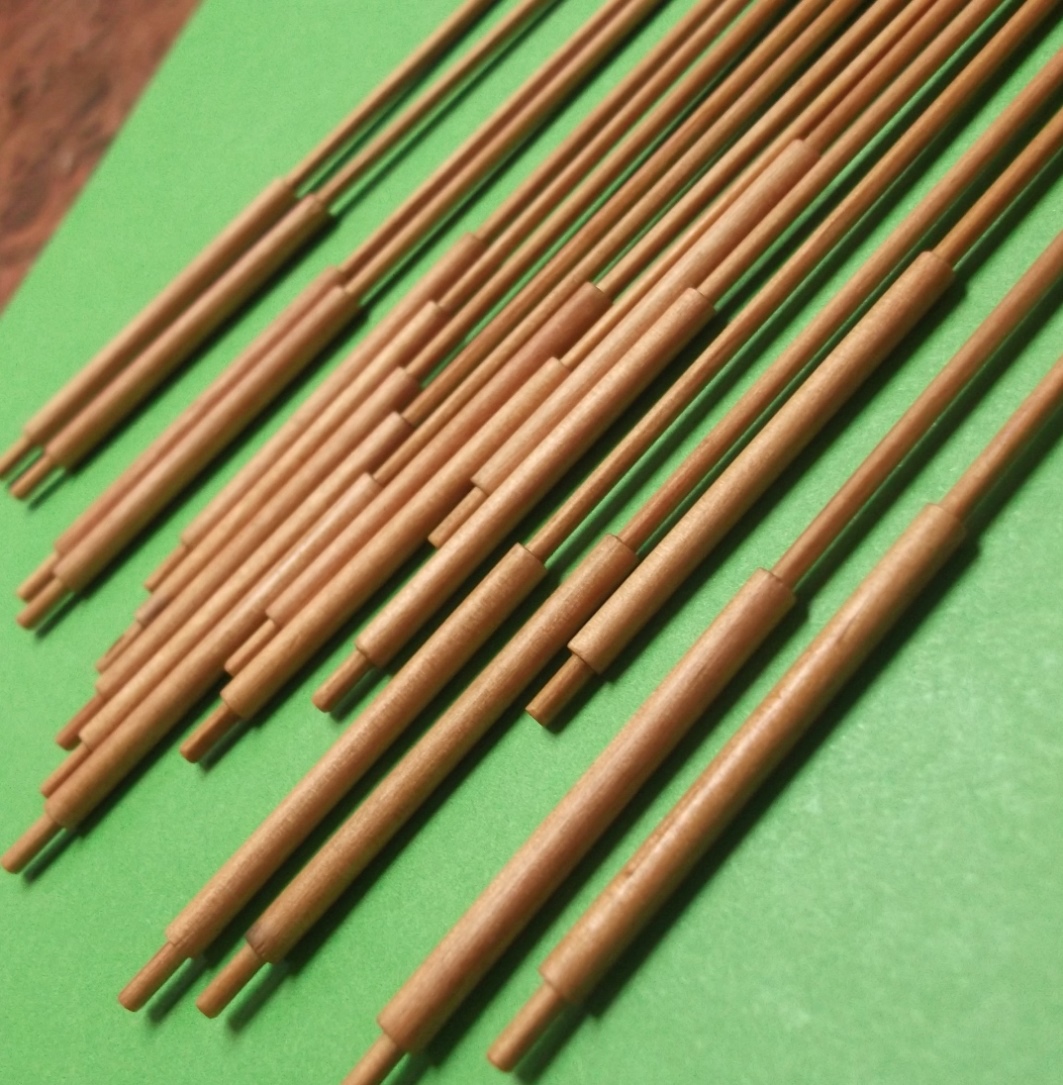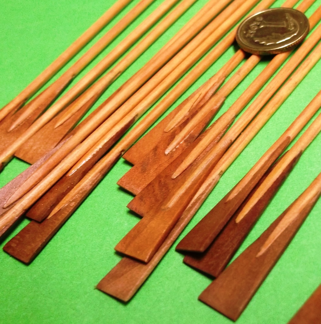 Stąd te błyszczące miejsca:Drzewca mają średnicę 2mm, a uchwyty 3,5mm:Komplet osiemnastu wioseł do alternatywnego napędu okrętu:
