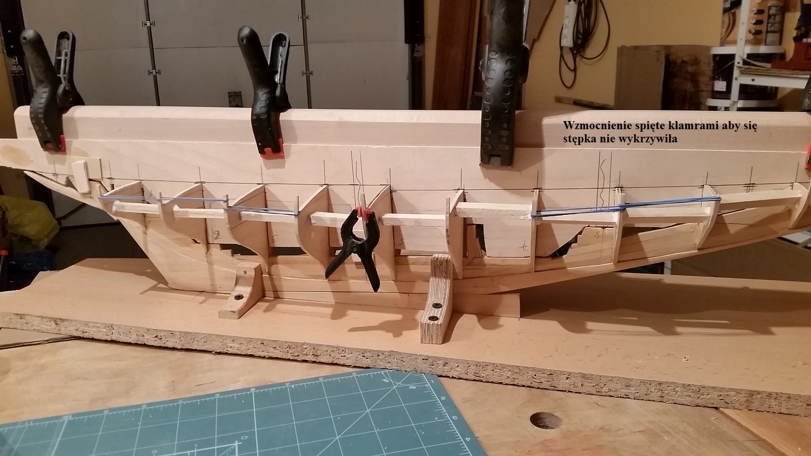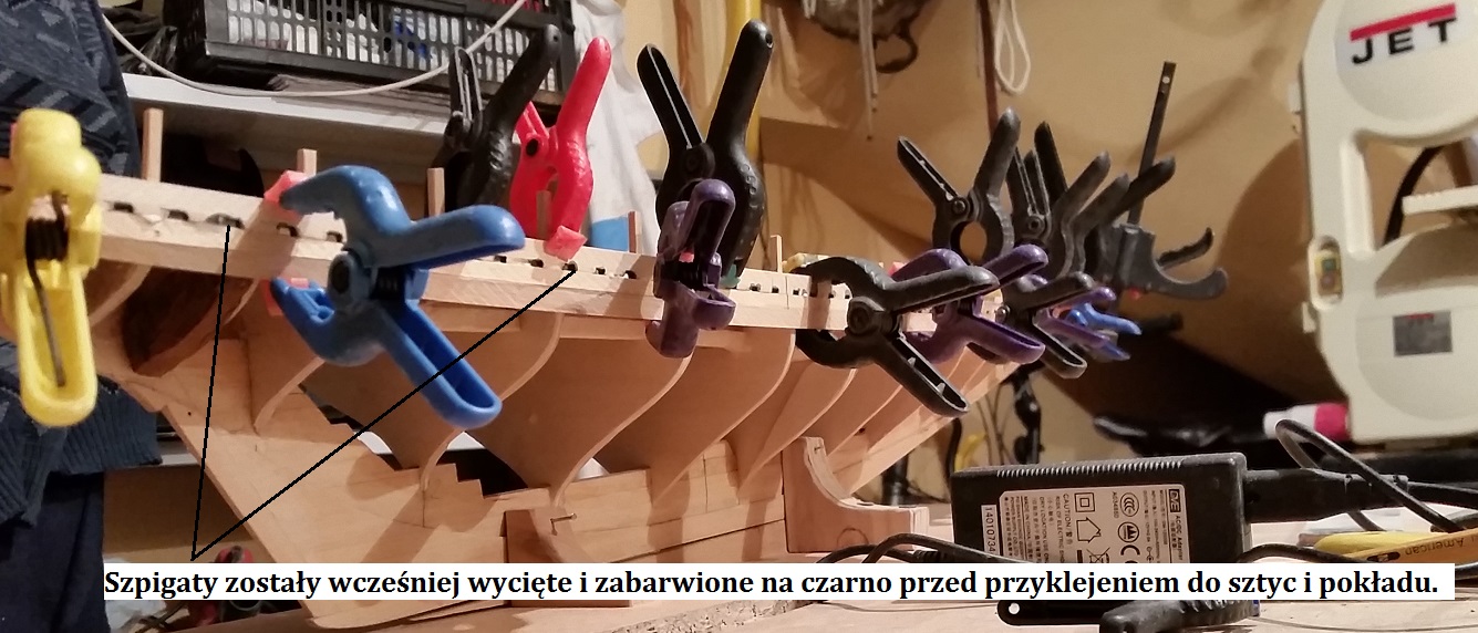 Moja stocznia jest b. prosta. Aby się stępka nie pokrzywiła wymyśliłem patent jak na Fot-4. Zdał egzamin. Fot-5; 5A i 5B. Po wklejeniu mocnic pokładowych (przekrój 3x8mm Fot-5B), zostały w nich wycięte otwory na sztyce pokładowe. Następnie położono pokład. Listewki pokładu zostały wcześniej przygotowane (przekrój 3x3mm), krawędzie oklejone czarnym kartonem, a przed wklejeniem sztyc nadburcia pokład został zeszlifowany do grubości ok. 2mm. Na koniec pokład został przetarty papierem 180 i pomalowany lakierem bezbarwnym nitro, a następnie przetarty cykliną. Powstała gładka i matowa powierzchnia. Mocnice nadburcia przyklejone zostały do wręg i odpowiednio zukosowane jak wręgi.