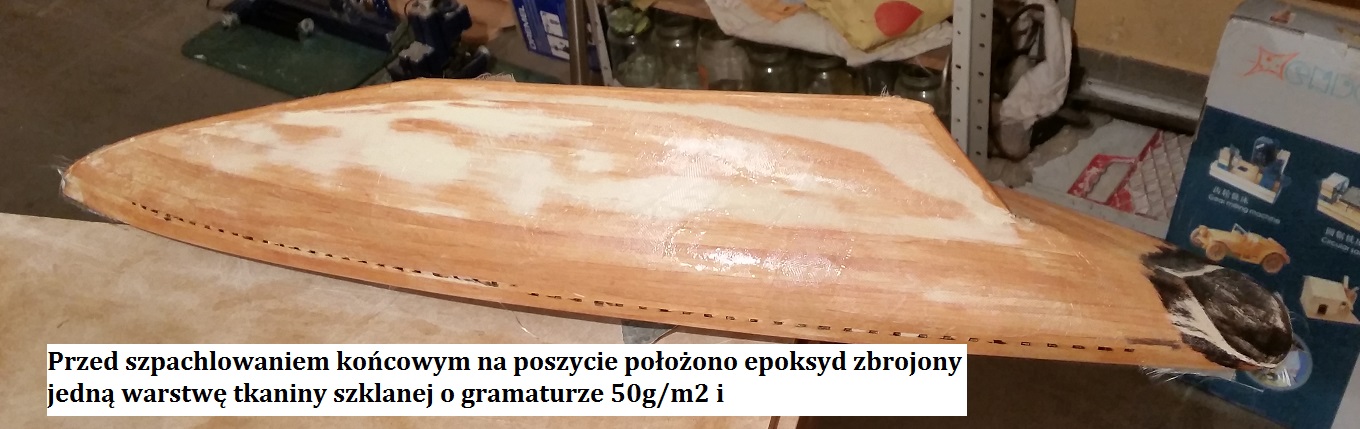 Frez śr.1mm. Po wyschnięciu kadłub został przeszlifowany papierem 60, potem 80. Następnie zaszpachlowany szpachlą poliestrową. Po doprowadzeniu do „idealnej płynności linii poszycia” - tak mi się wydawało - poszycie zostało pomalowane rzadką szpachlą (czarny akryl + talk) i po wyschnięciu znowu było szlifowane i tak w kółko aż do znudzenia. Następnie położono epoksyd + 1 warstwa maty szklanej gr. 50g/m2. I ponownie do znudzenia szlifowano, szpachlowano, szlifowano, szpachlowno...Fot 9; 9A; 10
