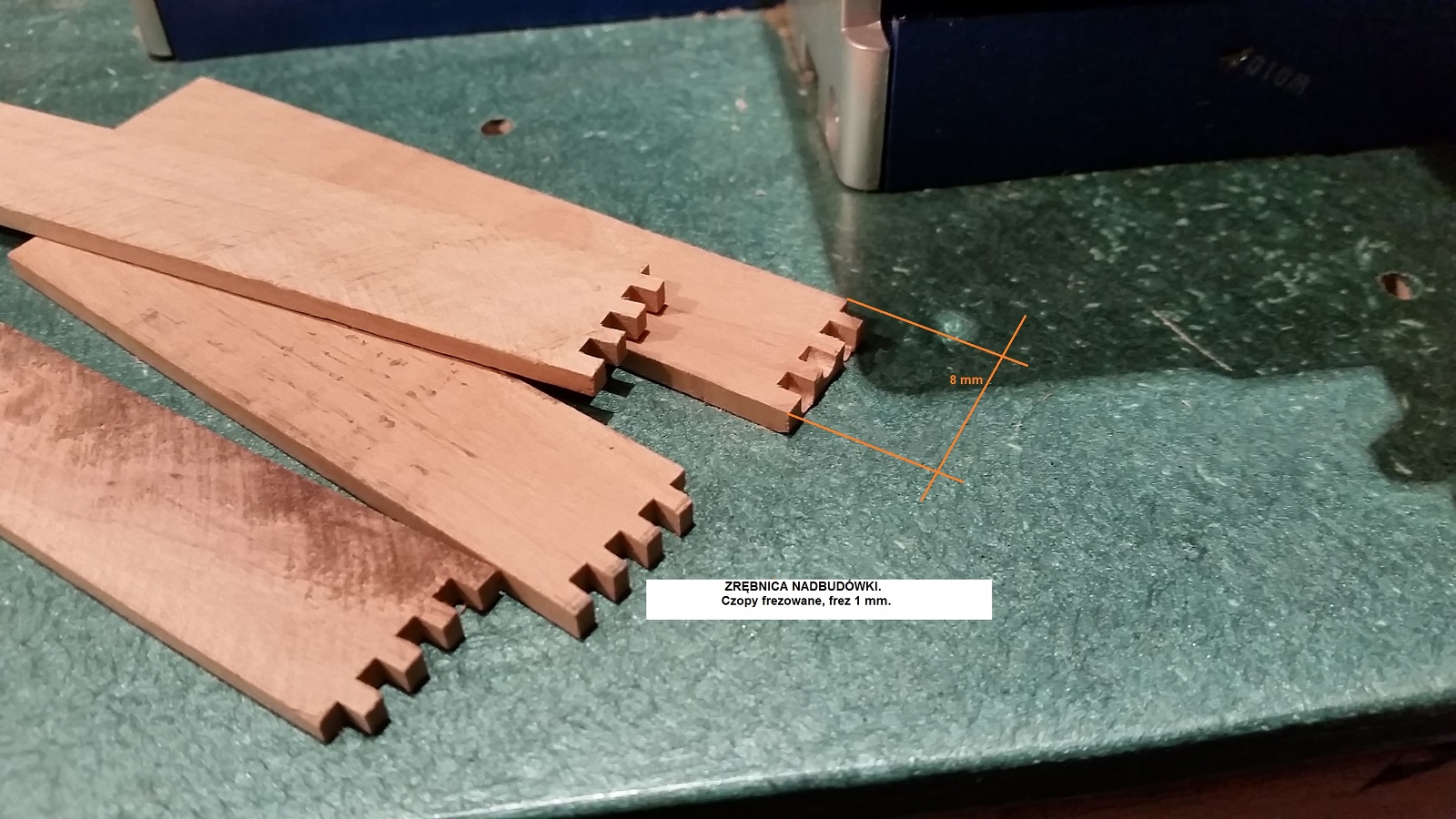 W trakcie jak poszycie było wykonywane – powstawały inne elementy szkunera. Na Fot-8 pokazano zrębnicę nadbudówki. Czopy zostały wyfrezowane na „chińskim badziewiu”.