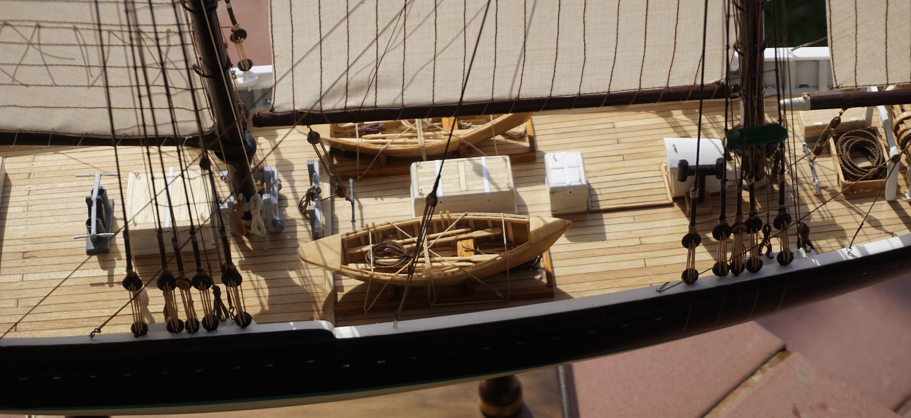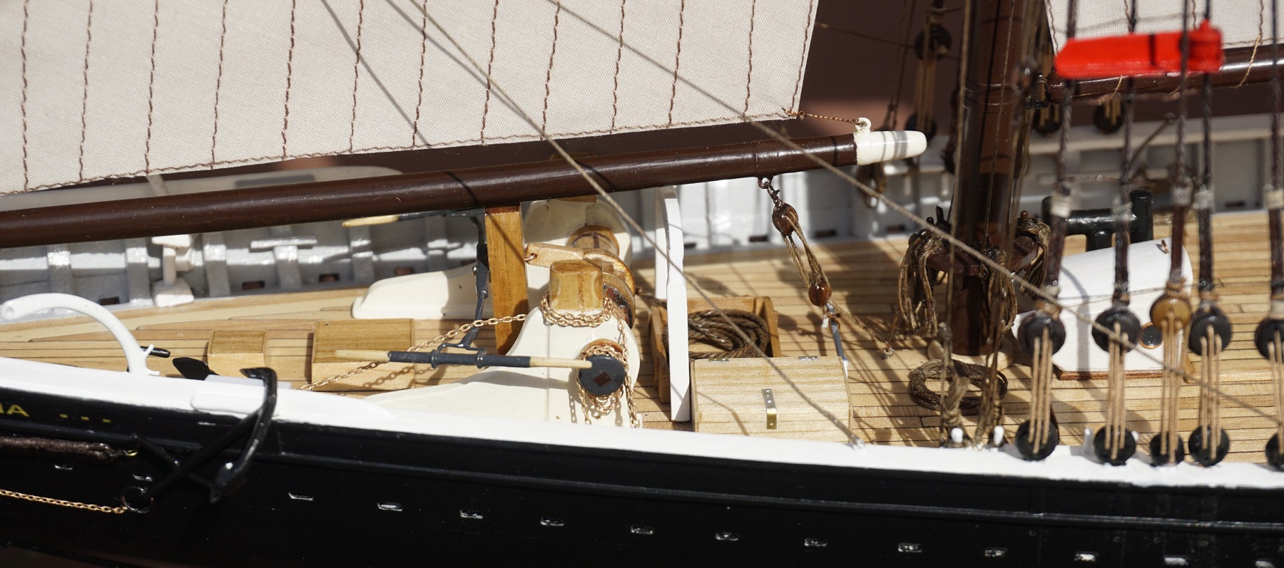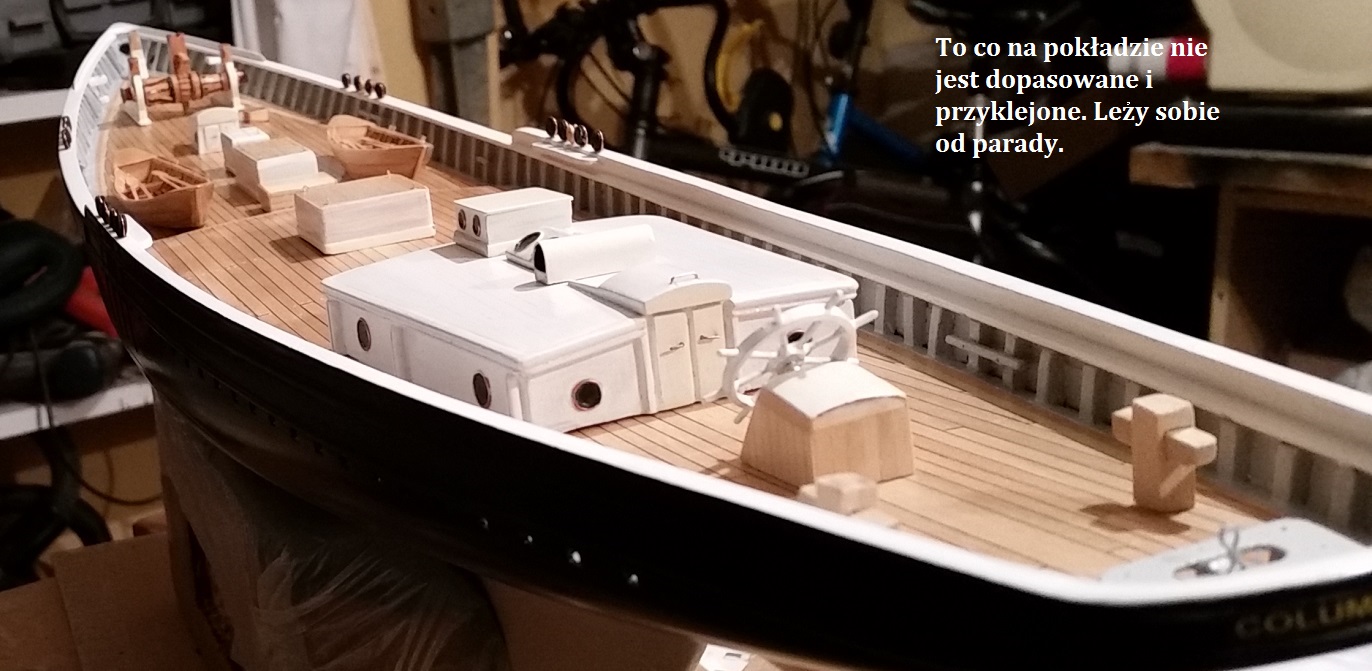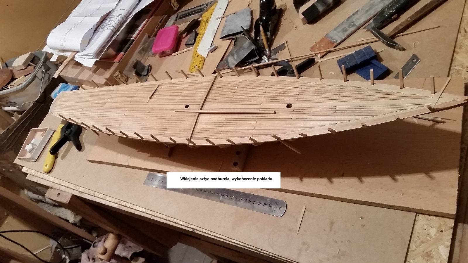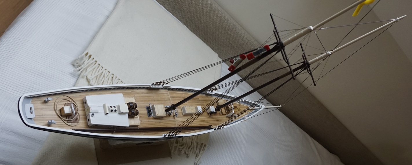 Po zamocowaniu zrębnic nadburcia wklejono ławy pod nagle i wstawiono nagle. Potem dopasowane i przyklejono wszystko co na pokładzie ma być. Pokład musiał zostać wykończony prawie na „zicher” przed postawieniem masztów. Foto-18. Wstawiono wszystkie knagi i oka pod talie fałów, szotów baksztagów i.t.p. Postawiono i wklejono kolumny masztów. Stan na 14.1.2016 – Maszty wraz ze stengami stoją. Wanty, sztagi, paduny, baksztagi oraz wszystkie wyblinki powiązane. Bukszpryt wraz z olinowaniem zamocowany. Żagle uszyte czekają na swoją kolej. Na zdjęciach pozostałych różne elementy modelu. Jak wrócę do domu do doślę fotki z aktualnego stanu.