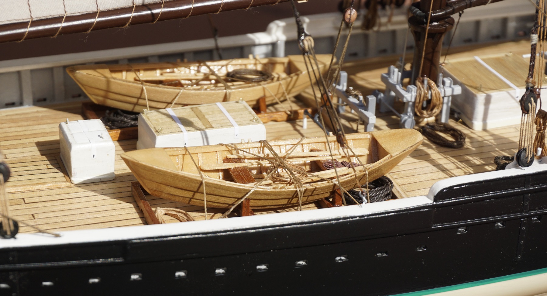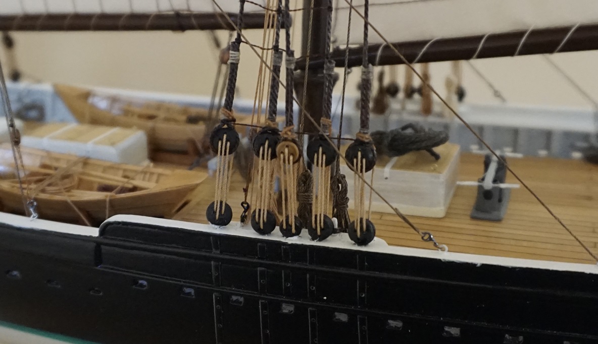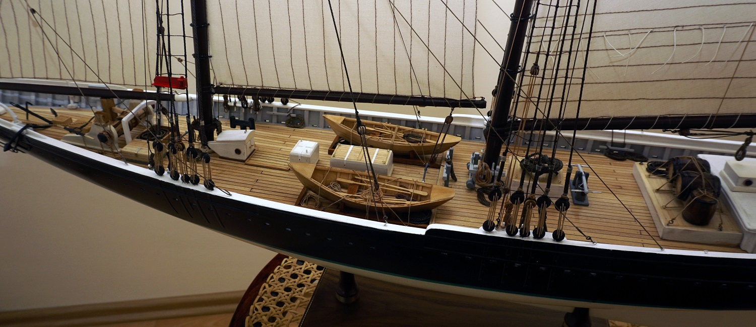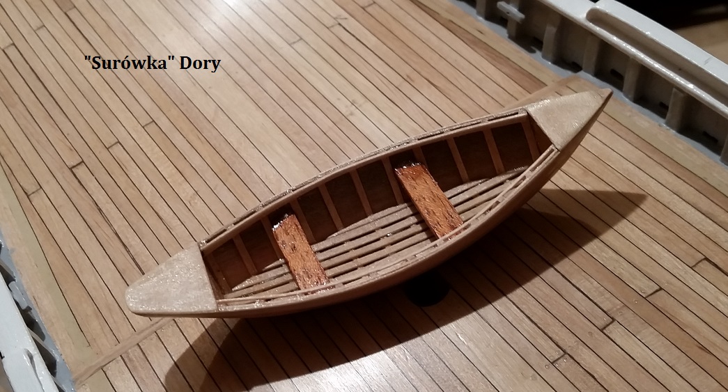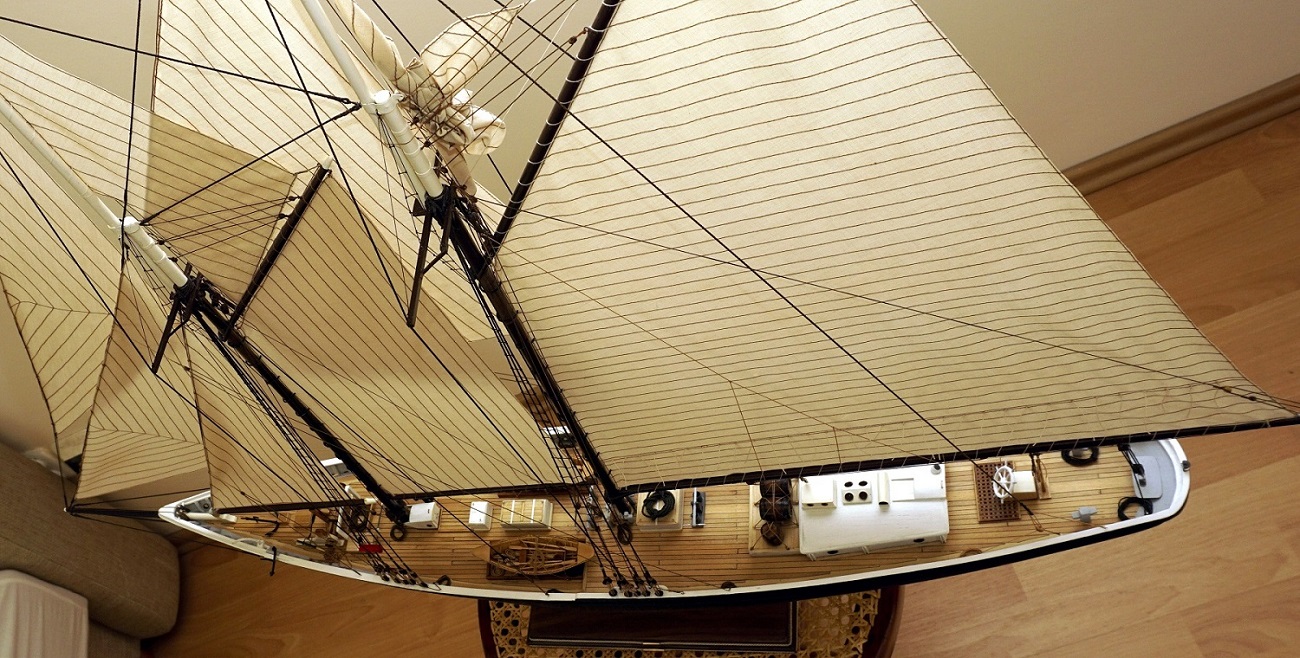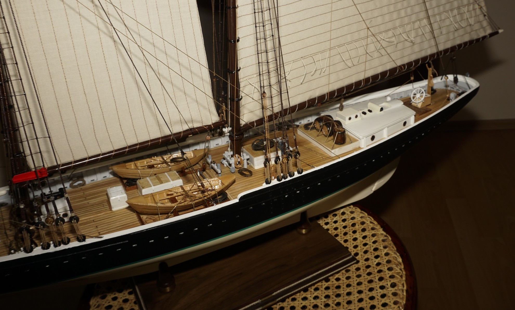 Po zamocowaniu zrębnic nadburcia wklejono ławy pod nagle i wstawiono nagle. Potem dopasowane i przyklejono wszystko co na pokładzie ma być. Pokład musiał zostać wykończony prawie na „zicher” przed postawieniem masztów. Foto-18. Wstawiono wszystkie knagi i oka pod talie fałów, szotów baksztagów i.t.p. Postawiono i wklejono kolumny masztów. Stan na 14.1.2016 – Maszty wraz ze stengami stoją. Wanty, sztagi, paduny, baksztagi oraz wszystkie wyblinki powiązane. Bukszpryt wraz z olinowaniem zamocowany. Żagle uszyte czekają na swoją kolej. Na zdjęciach pozostałych różne elementy modelu. Jak wrócę do domu do doślę fotki z aktualnego stanu.