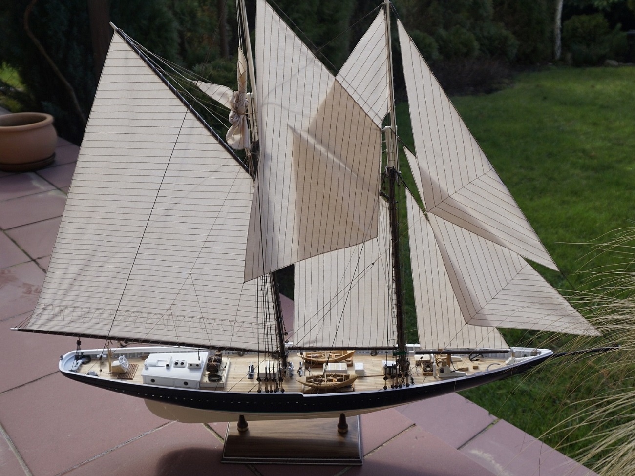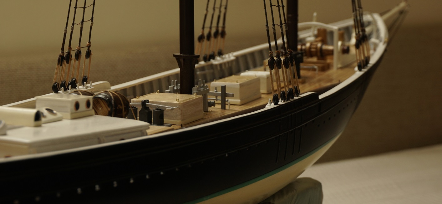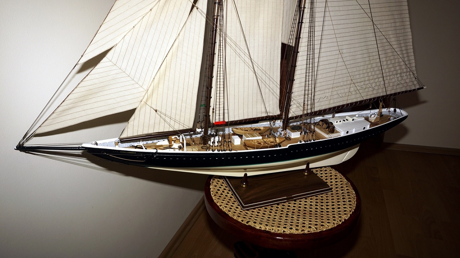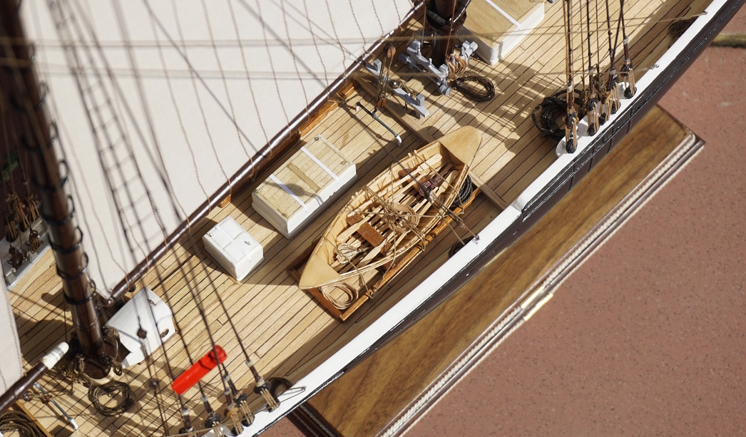 Po zamocowaniu zrębnic nadburcia wklejono ławy pod nagle i wstawiono nagle. Potem dopasowane i przyklejono wszystko co na pokładzie ma być. Pokład musiał zostać wykończony prawie na „zicher” przed postawieniem masztów. Foto-18. Wstawiono wszystkie knagi i oka pod talie fałów, szotów baksztagów i.t.p. Postawiono i wklejono kolumny masztów. Stan na 14.1.2016 – Maszty wraz ze stengami stoją. Wanty, sztagi, paduny, baksztagi oraz wszystkie wyblinki powiązane. Bukszpryt wraz z olinowaniem zamocowany. Żagle uszyte czekają na swoją kolej. Na zdjęciach pozostałych różne elementy modelu. Jak wrócę do domu do doślę fotki z aktualnego stanu.