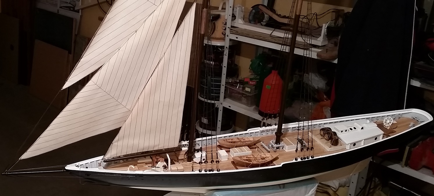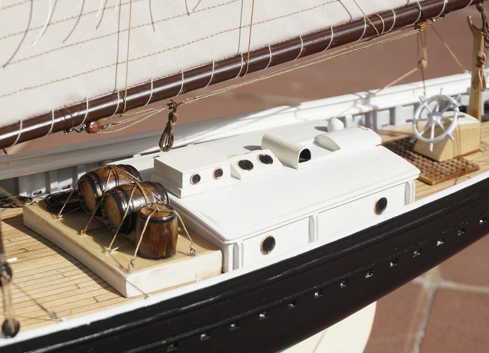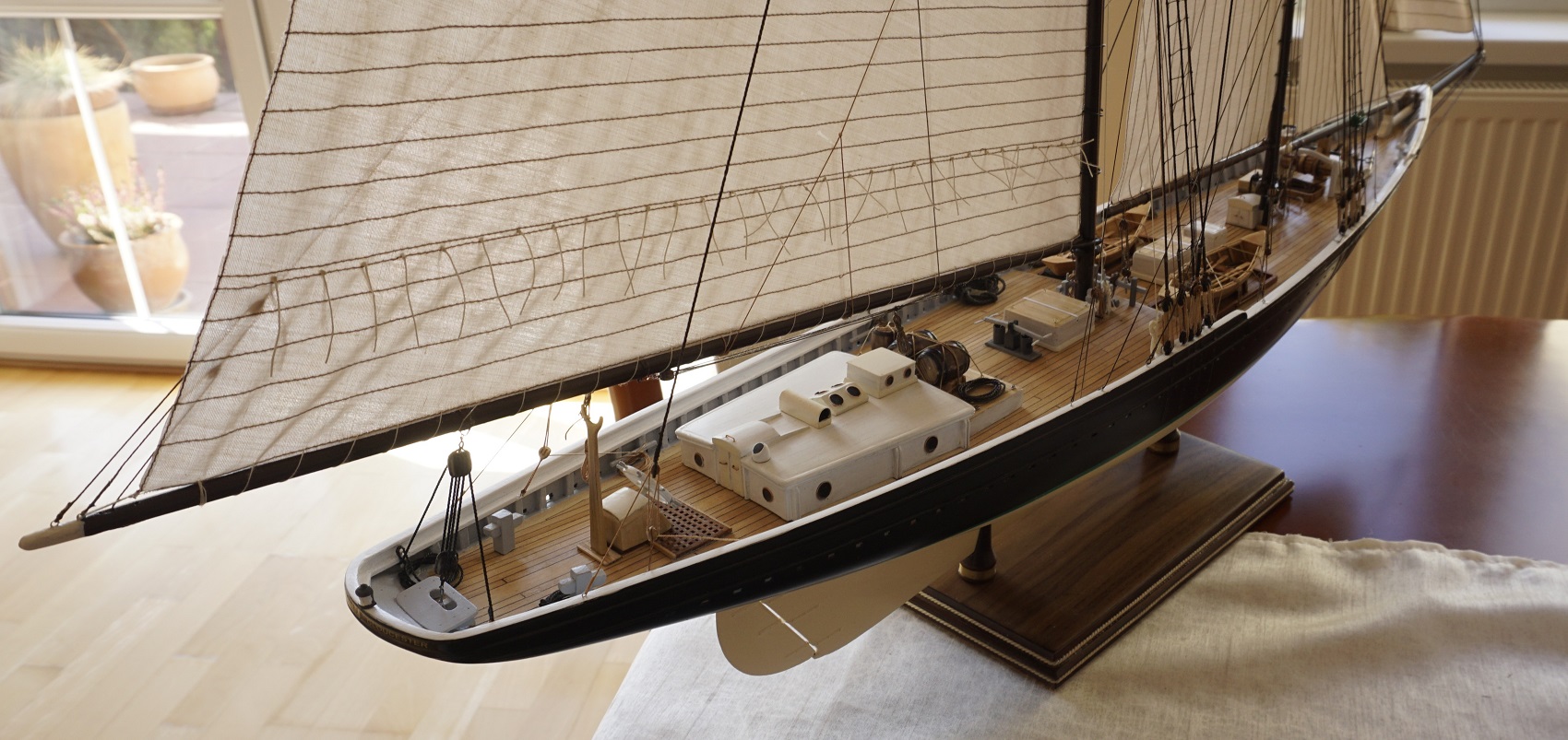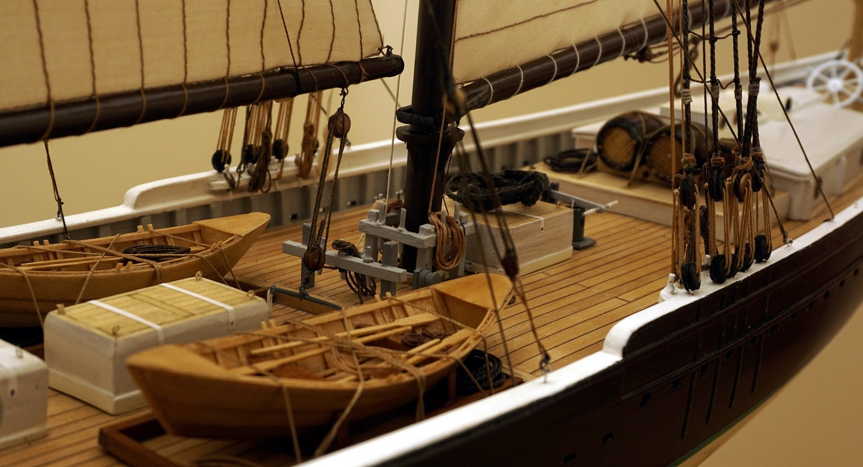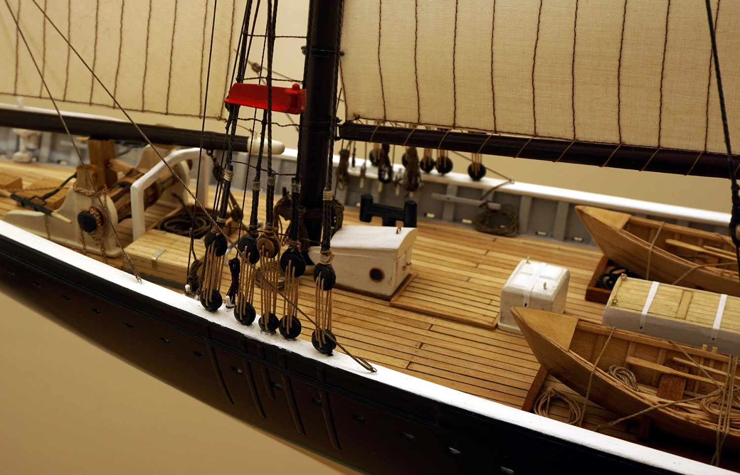 Po zamocowaniu zrębnic nadburcia wklejono ławy pod nagle i wstawiono nagle. Potem dopasowane i przyklejono wszystko co na pokładzie ma być. Pokład musiał zostać wykończony prawie na „zicher” przed postawieniem masztów. Foto-18. Wstawiono wszystkie knagi i oka pod talie fałów, szotów baksztagów i.t.p. Postawiono i wklejono kolumny masztów. Stan na 14.1.2016 – Maszty wraz ze stengami stoją. Wanty, sztagi, paduny, baksztagi oraz wszystkie wyblinki powiązane. Bukszpryt wraz z olinowaniem zamocowany. Żagle uszyte czekają na swoją kolej. Na zdjęciach pozostałych różne elementy modelu. Jak wrócę do domu do doślę fotki z aktualnego stanu.