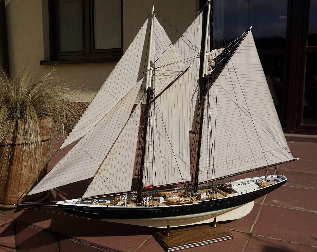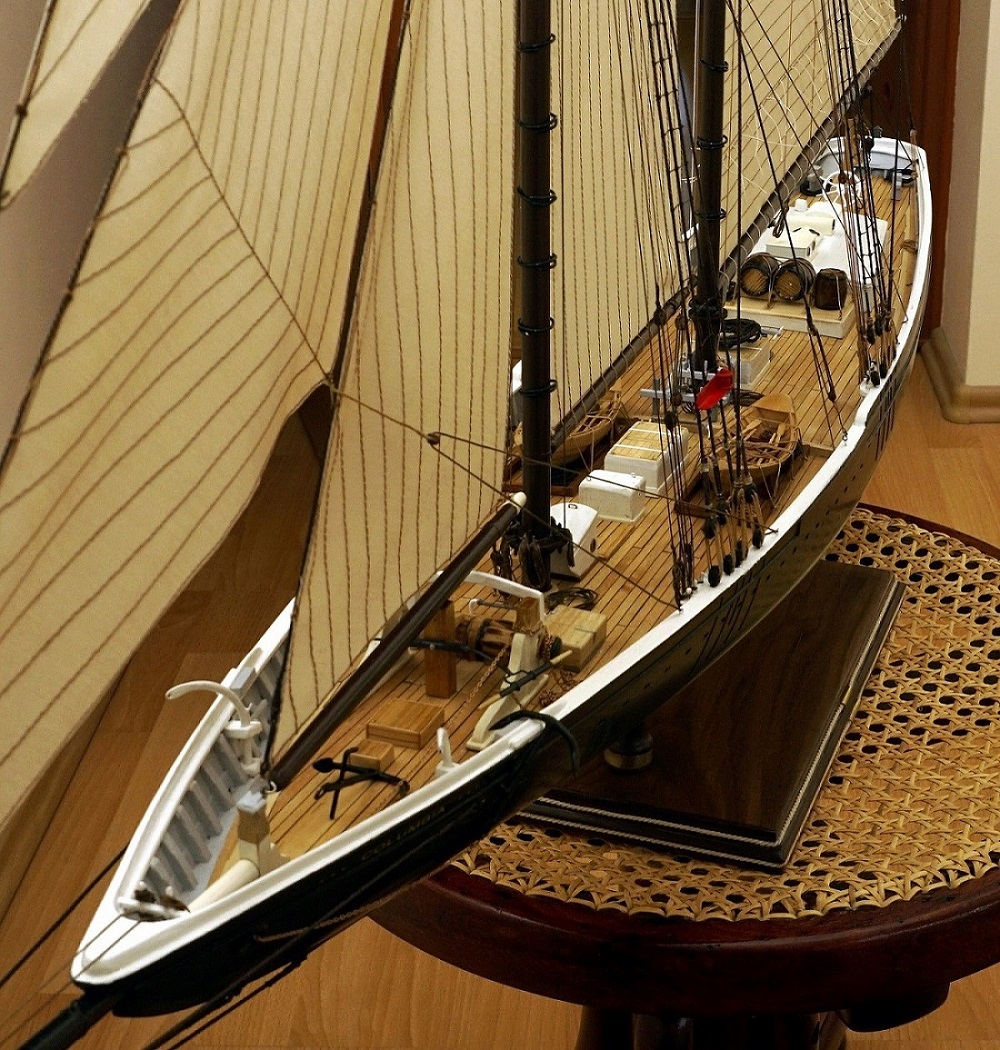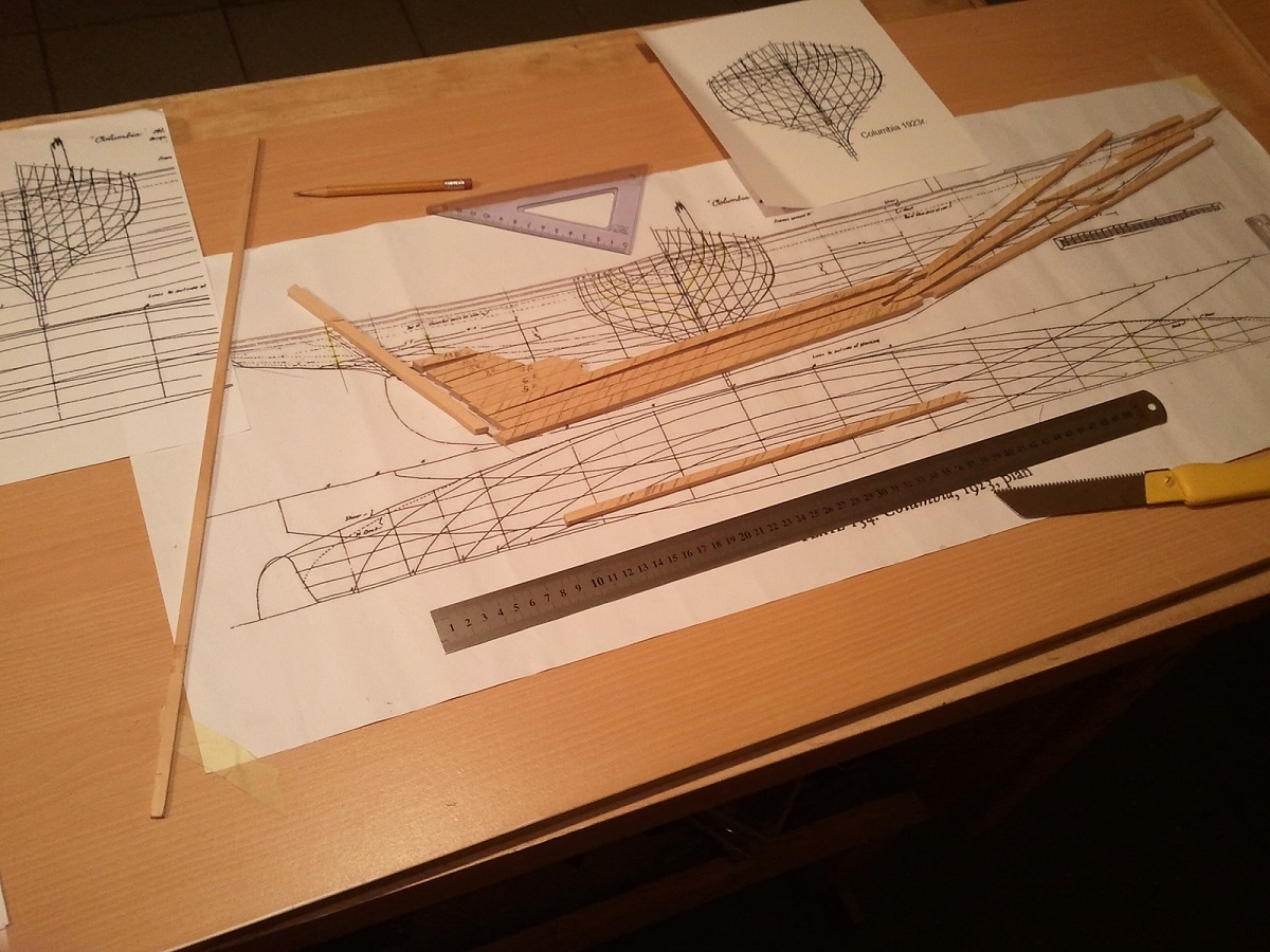 Budowa zaczęła się w lipcu 2014 (Jak to dawno było). Dysponowałem jedynie rysunkami linii teoretycznych kadłuba, planem olinowania stałego i planem ożaglowanie dostępnymi w książce "American Fishing Schooners 1825-1935" Chapelle'a… Obrazki te zeskanowałem, powiększyłem i powstały plany. Do tego kilkadziesiąt zdjęć znalezionych w internecie. Nic więcej.