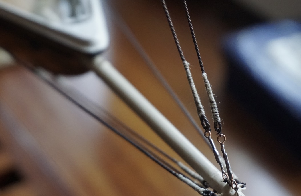 Sztagi na bukszprycie. Lina owijająca szplajsy będzie pomalowana w kolorze sztagów. Ściągacze będą malowane na czarno.