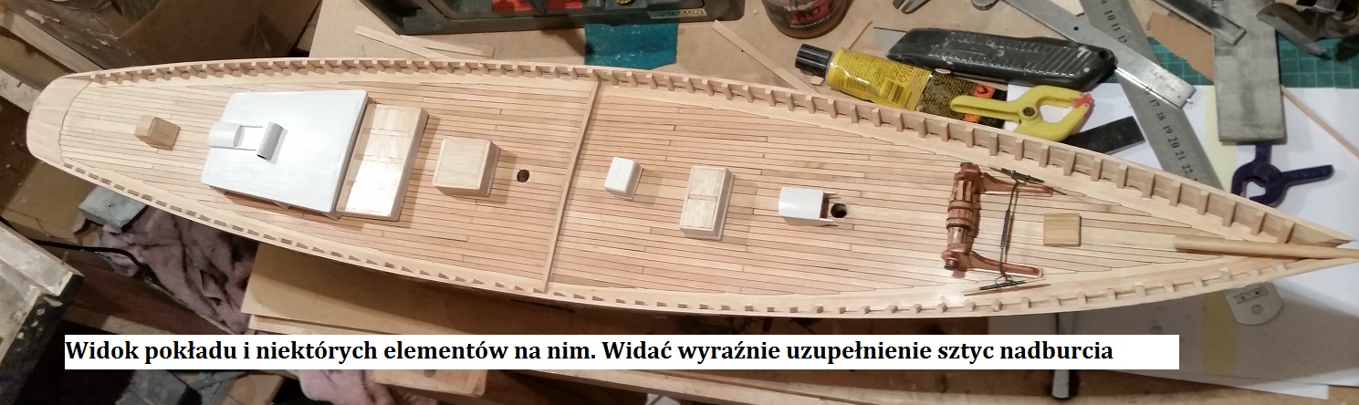 Po zamocowaniu zrębnic nadburcia wklejono ławy pod nagle i wstawiono nagle. Potem dopasowane i przyklejono wszystko co na pokładzie ma być. Pokład musiał zostać wykończony prawie na „zicher” przed postawieniem masztów. Foto-18. Wstawiono wszystkie knagi i oka pod talie fałów, szotów baksztagów i.t.p. Postawiono i wklejono kolumny masztów. Stan na 14.1.2016 – Maszty wraz ze stengami stoją. Wanty, sztagi, paduny, baksztagi oraz wszystkie wyblinki powiązane. Bukszpryt wraz z olinowaniem zamocowany. Żagle uszyte czekają na swoją kolej. Na zdjęciach pozostałych różne elementy modelu. Jak wrócę do domu do doślę fotki z aktualnego stanu.