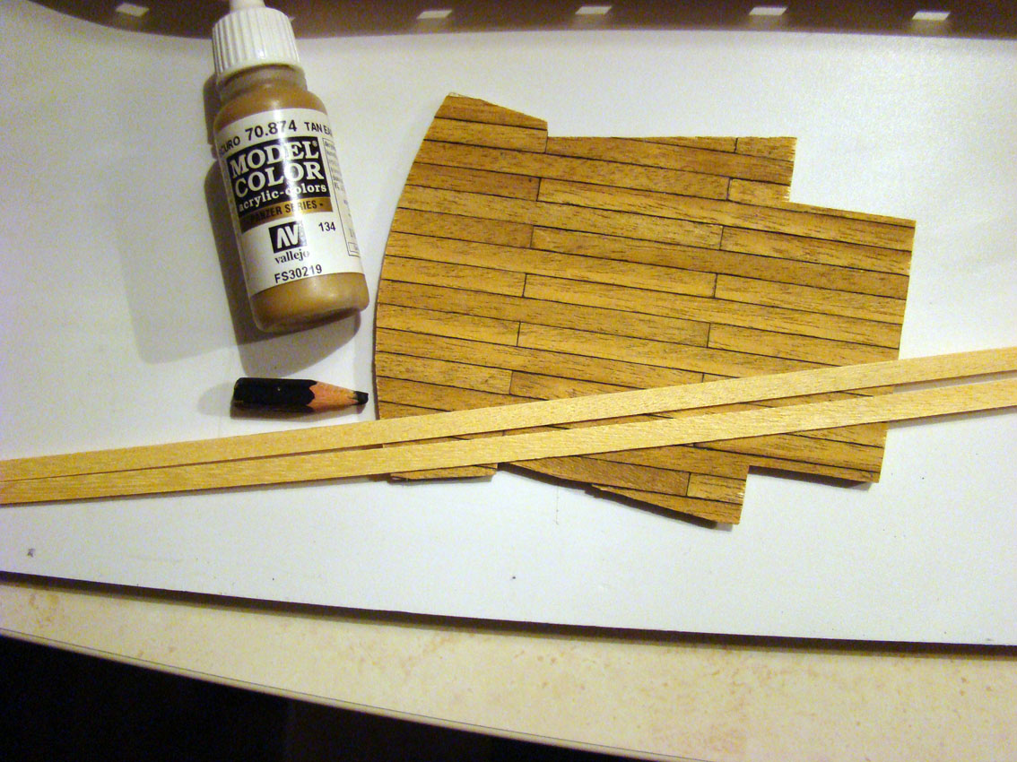 . Miękkie i tłuste czernidło dało radę jak na mój gust. Do wstępnego nadania koloru zastosowałem rozcieńczoną farbkę akrylową vallejo (tak doświadczalnie) dla porównania fabryczny fornir na pokłady.