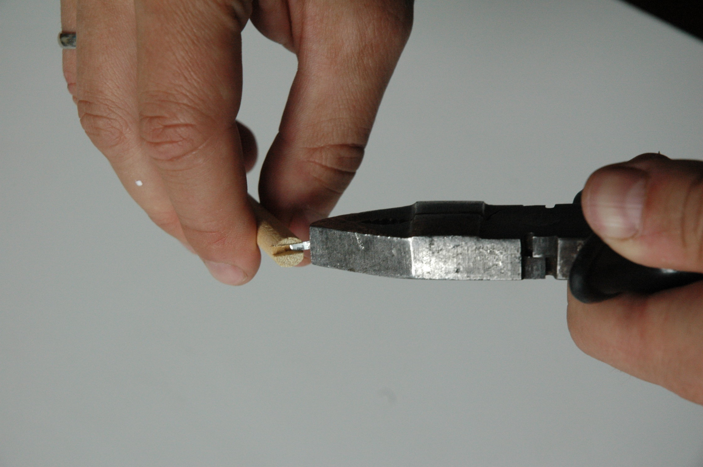 Wykonałem mocowanie bukszprytu oraz wstępnie przyciąłem sam bukszpryt aby sprawdzić czy dobrze będzie siedział. Ponieważ nie miałem odpowiednio małego dłutka aby wykonać gniazdo bukszprytu wyciąłem kawałek żyletki na odpowiednią szerokość i trzymając ją w kombinerkach użyłem jako dłuta. Drewno było w miarę miękkie więc działało.