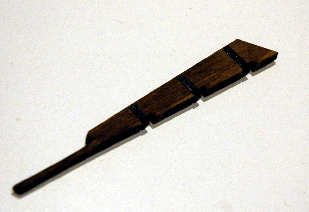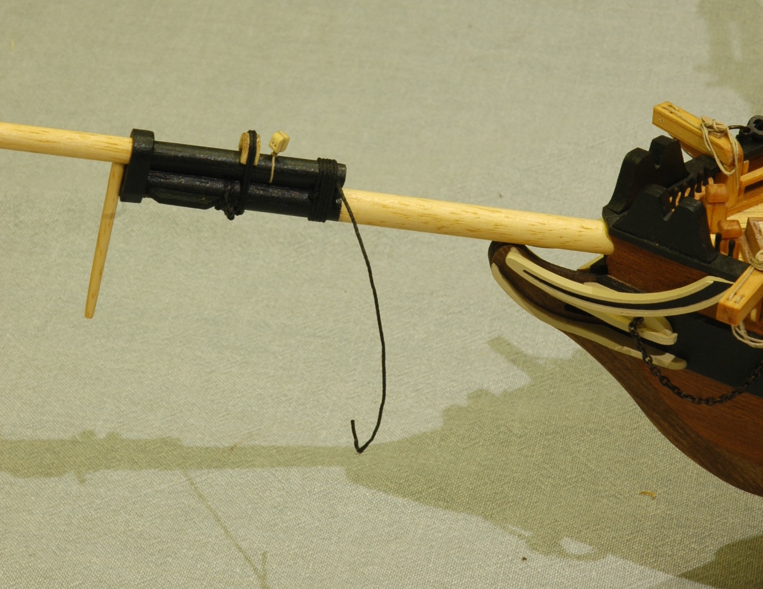 Wykonałem rumpel oraz talię ( nie wiem czy tak się nazywa to olinowanie w przypadku rumpla). Rumpel zrobiłem z wykałaczki, oryginalny z zestawu był metalowy i nie wyglądał zbyt ładnie.