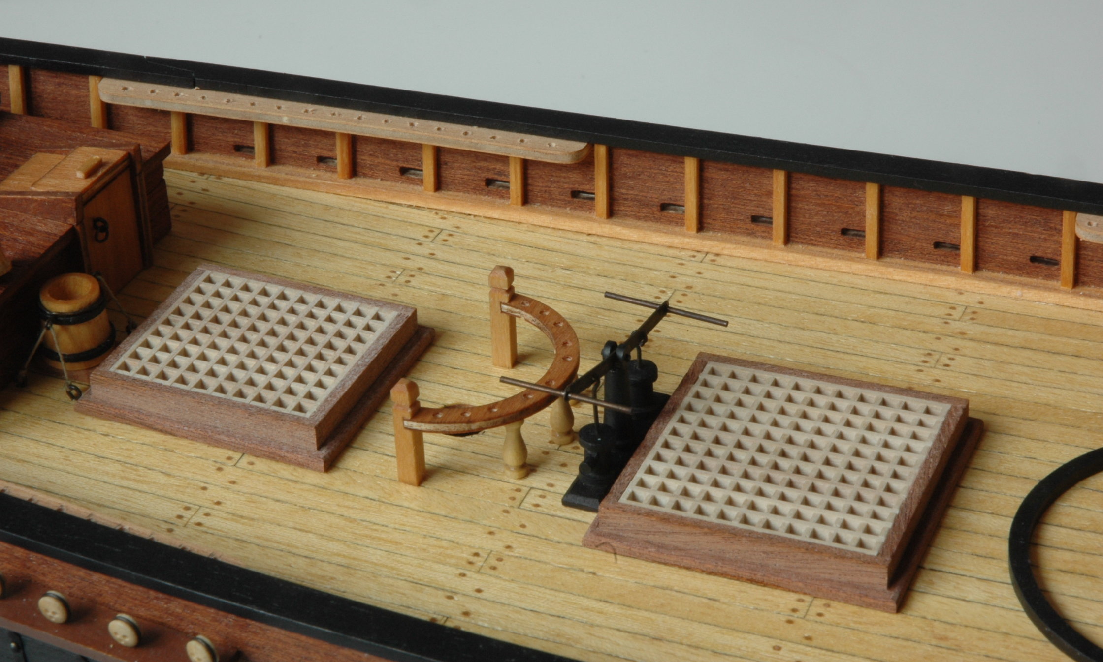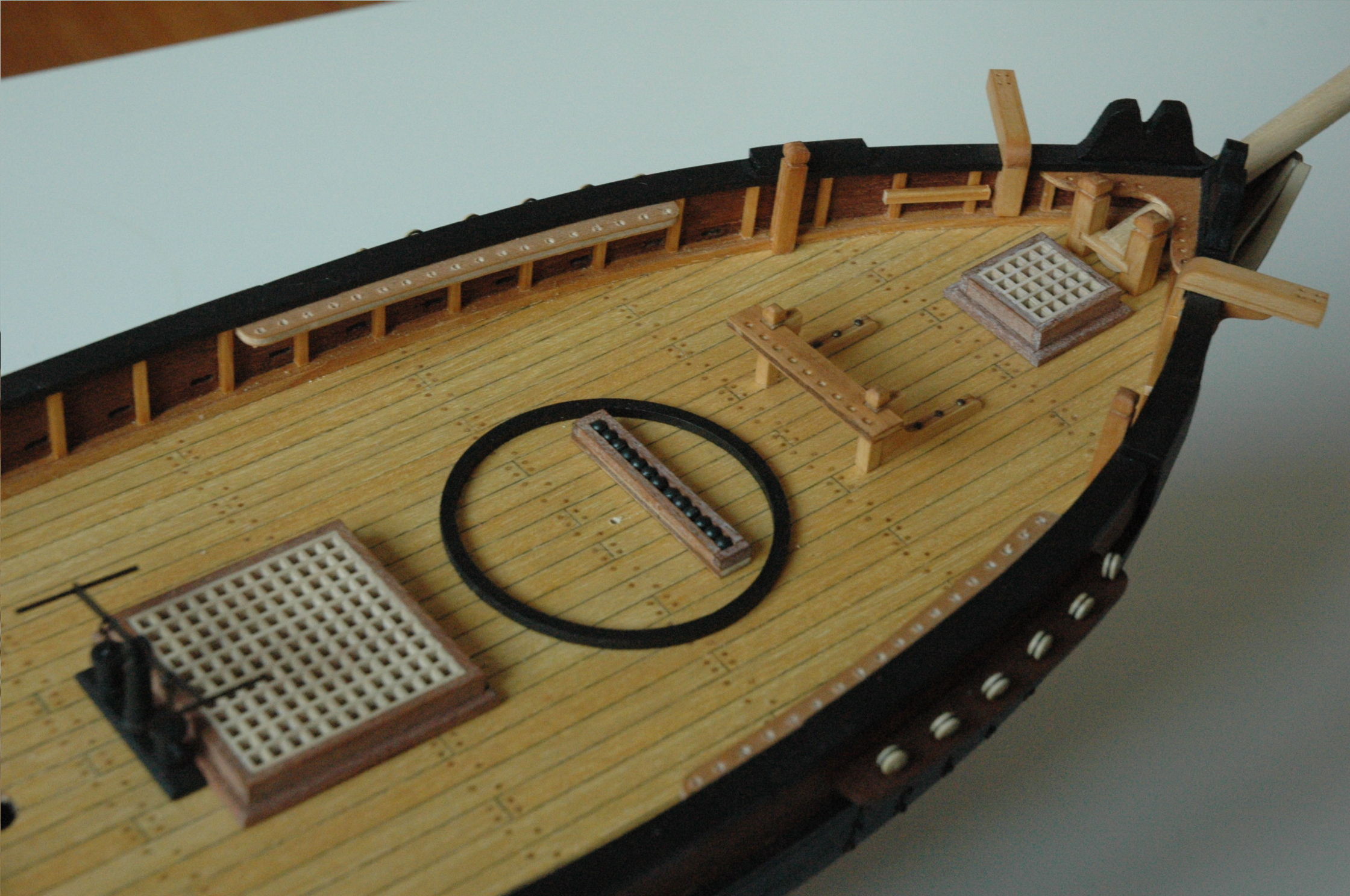 Powoli w wolnym czasie kontynuuję budowę, ostatnio pracuję nad elementami pokładu, pompa, nadbudówka z zejściami pod pokład (pewnie jest jakaś specjalna nazwa ale nie znam) i parę innych, cześć elementów jest jeszcze nieskończona i nie przyklejona do pokładu.