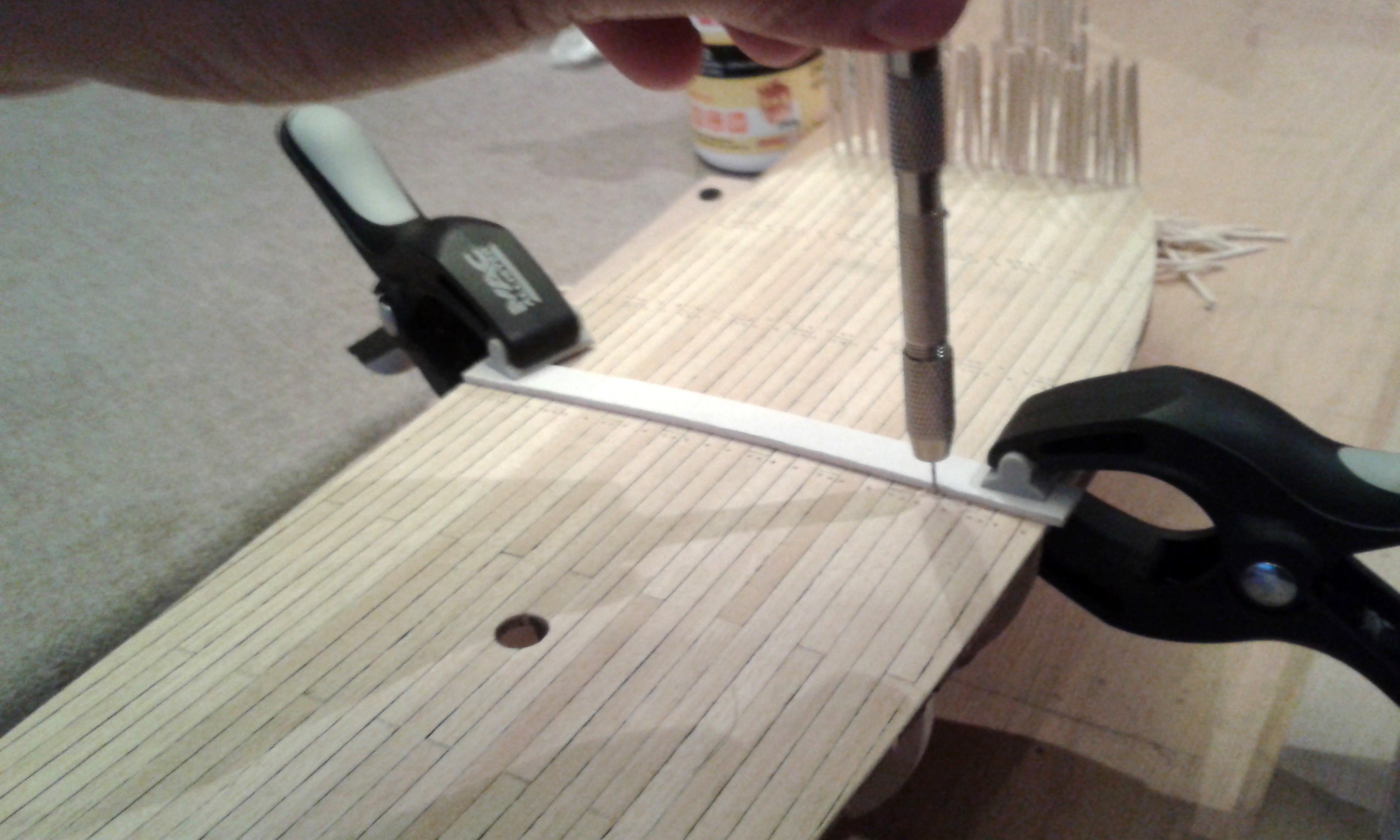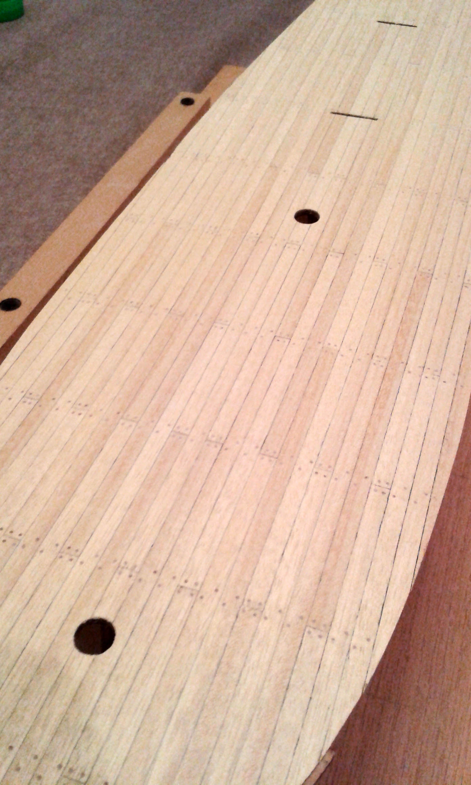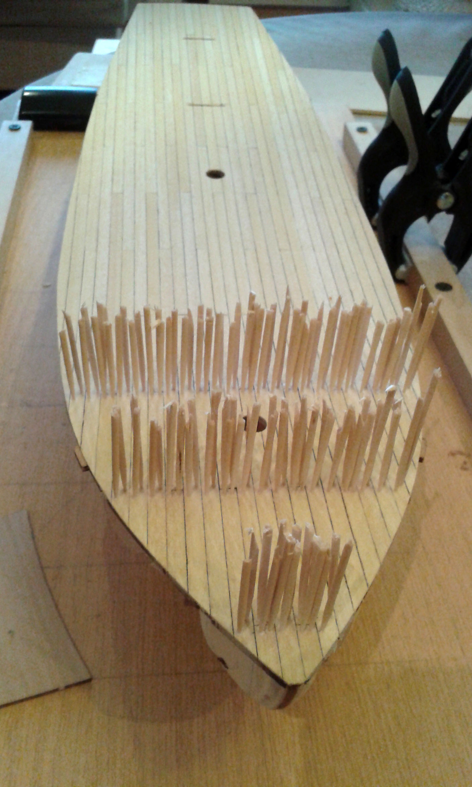 Wykonałem kołkowanie przy pomocy wykałaczek, najlepiej mi wyszła ta technika na kolejnej próbce, którą wykonałem. Po przycięciu wykałaczek wycyklinowałem pokład nożykiem segmentowym. Jeśli nie będzie uwag to zakładam, że teraz pora na malowanie pokłady pokostem, przed wykonaniem burt?