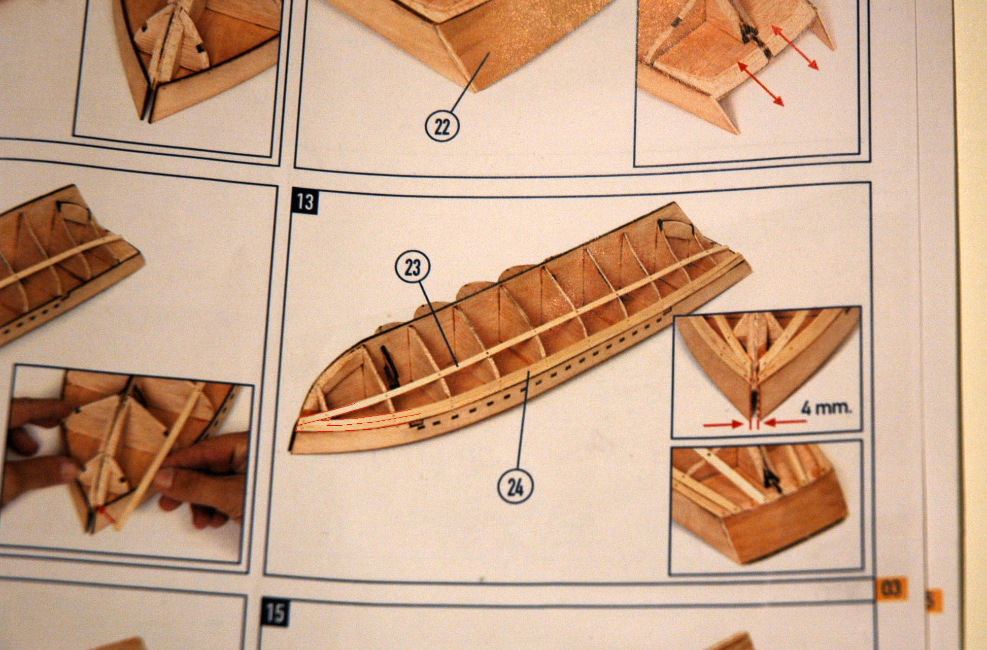 Akurat w tym miejscu instrukcji nie ma babola. Listwa nr 23 powinna być wklejona w te wycięcia we wręgach i nie wystawać ponad jej obrys. Jest ona jako wzdłużnik burtowy wzmacniający wręgi. Listwa nr 24 jako poszywająca powinna przykryć listwę nr 23. W Twoim przypadku listwa 23 wystaje poza obrys wręgi i będzie kolidowała z poszywającymi, trzeba więc ją zerwać i wkleić tak aby nie wystawała.