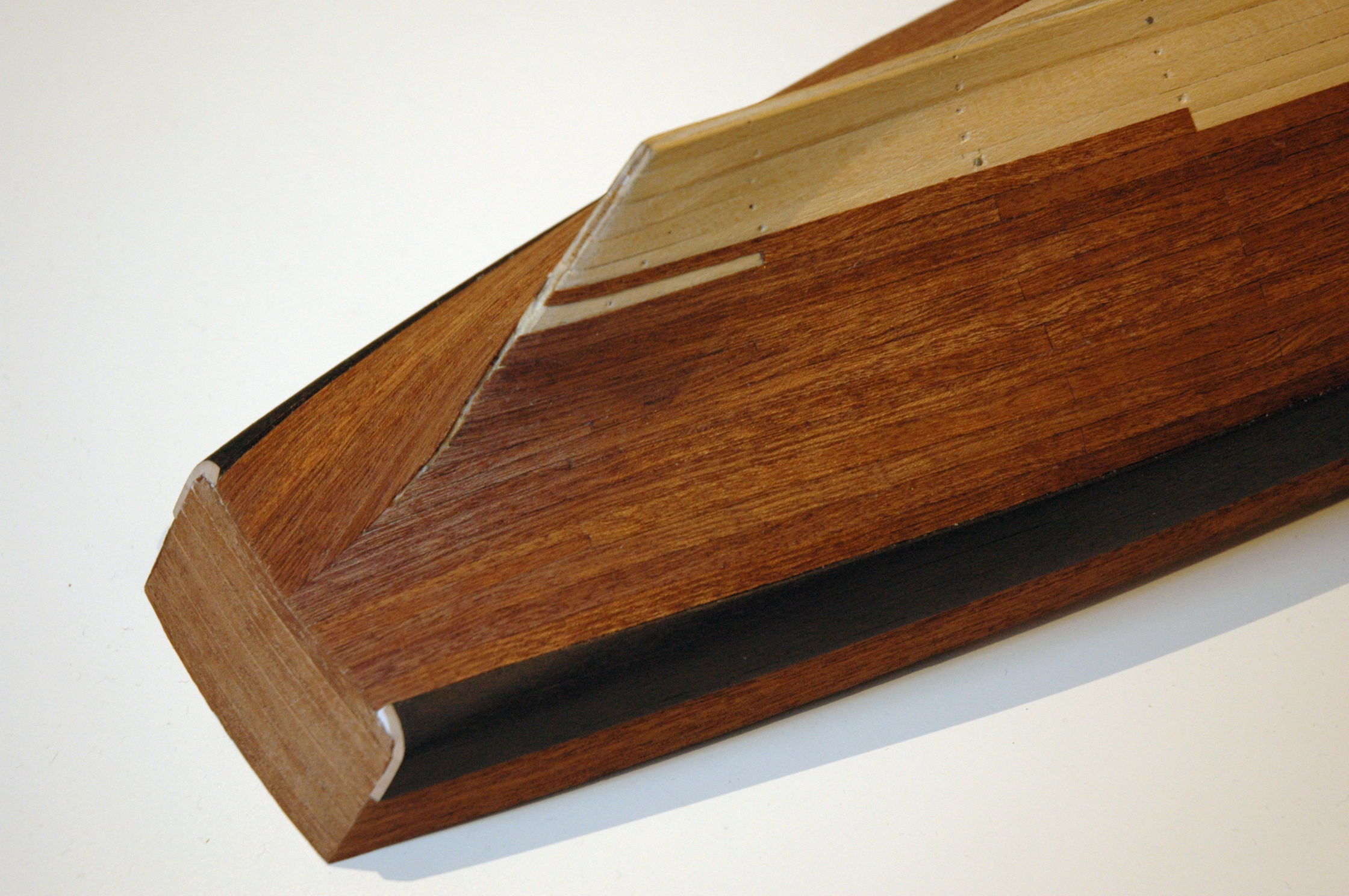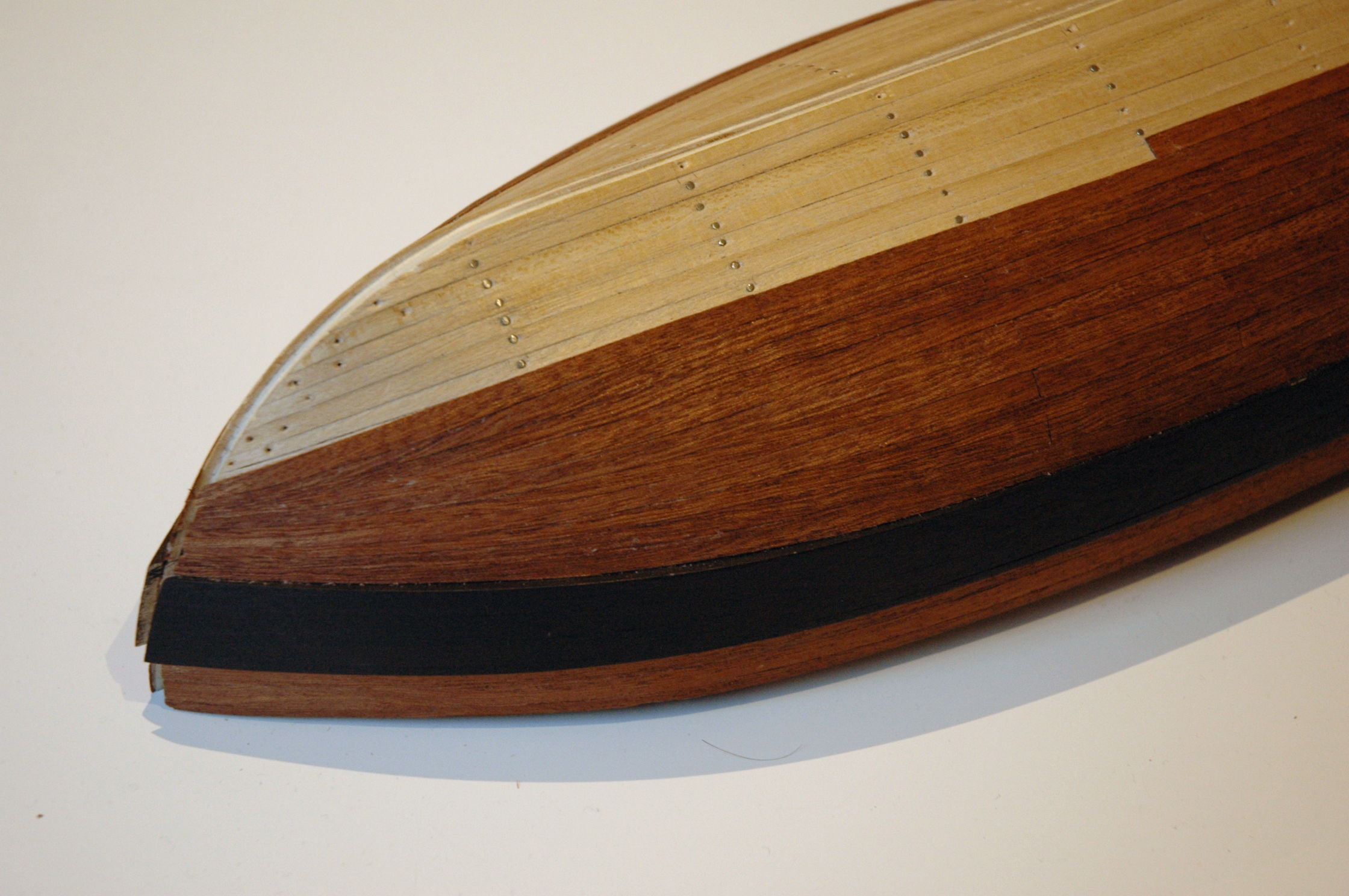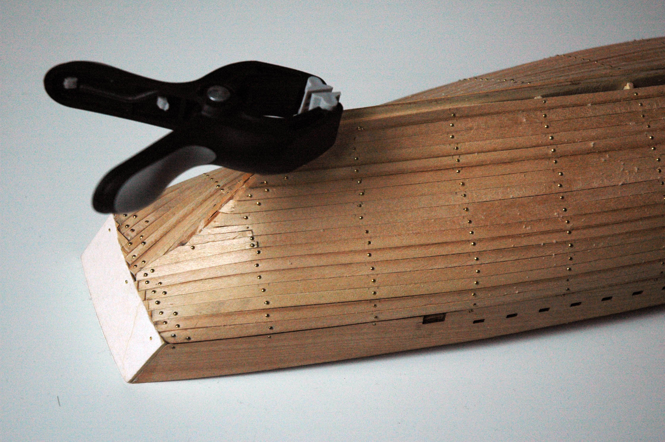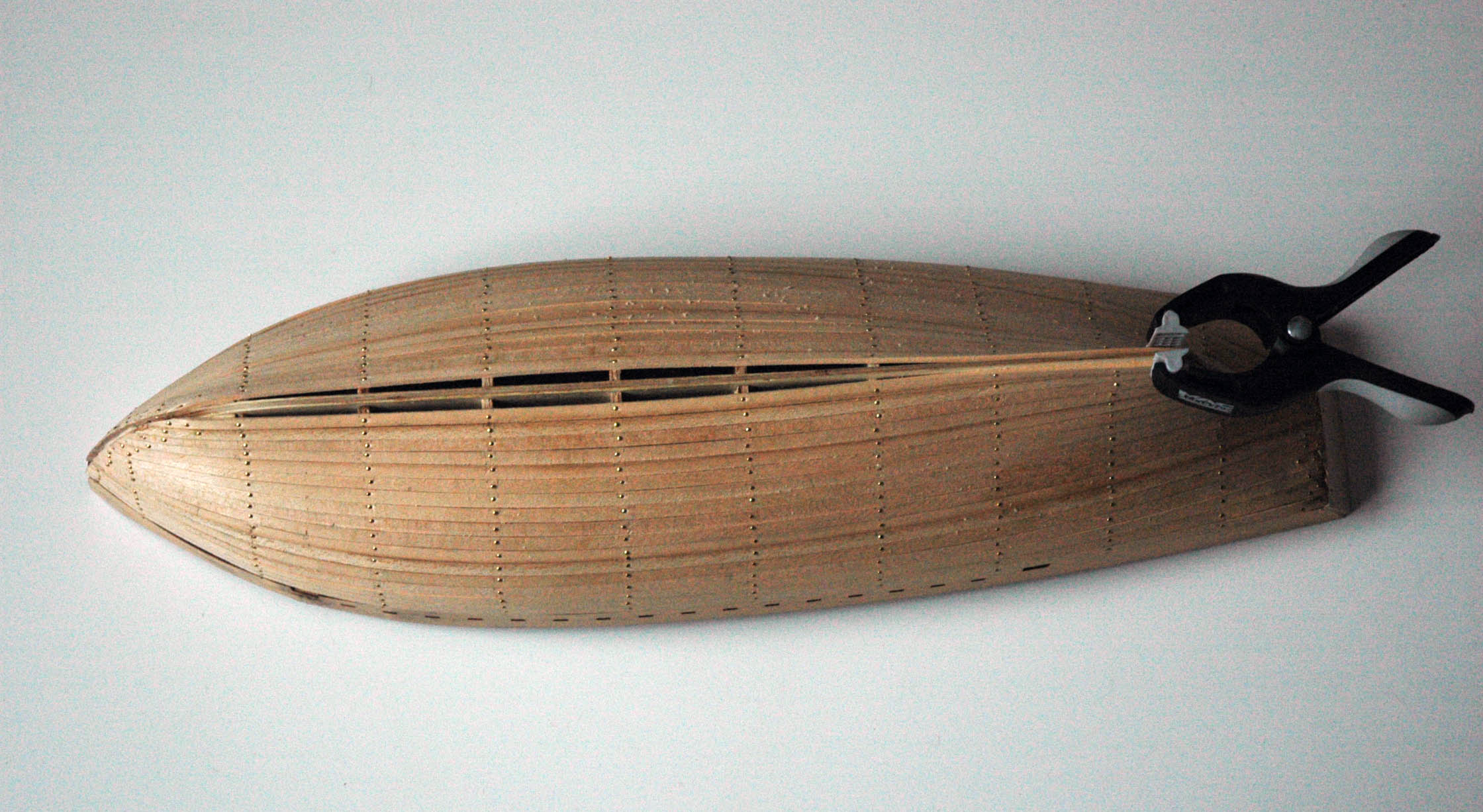 Udało mi się skończyć pierwszą warstwę deskowania. Teraz będę szlifował kadłub i dopsaowywał szczelinę do zamocowania kilu.