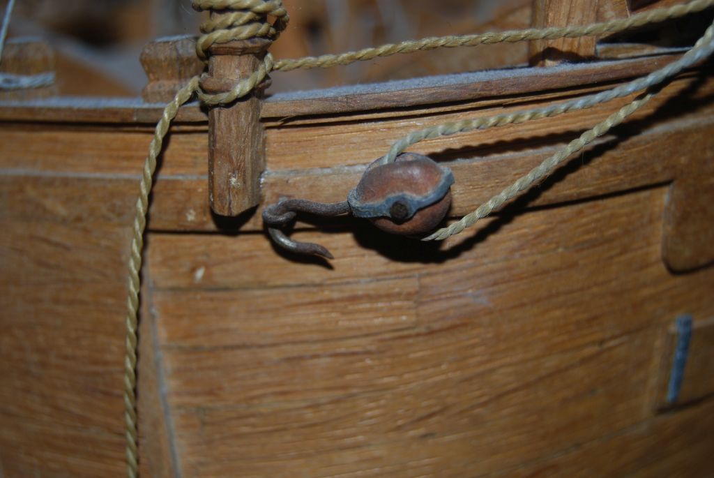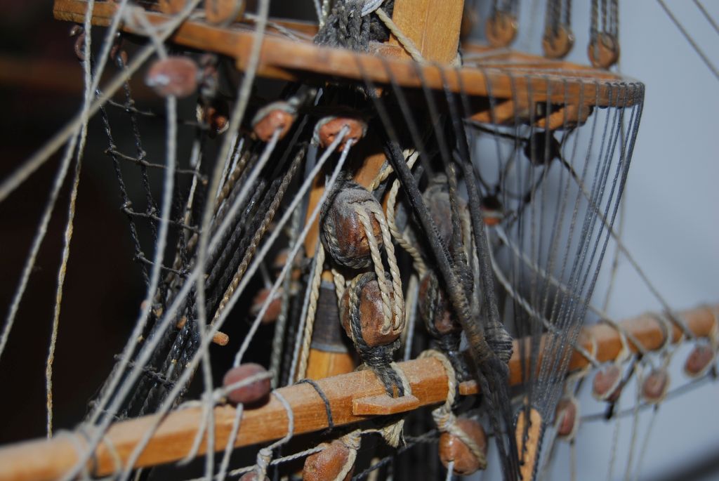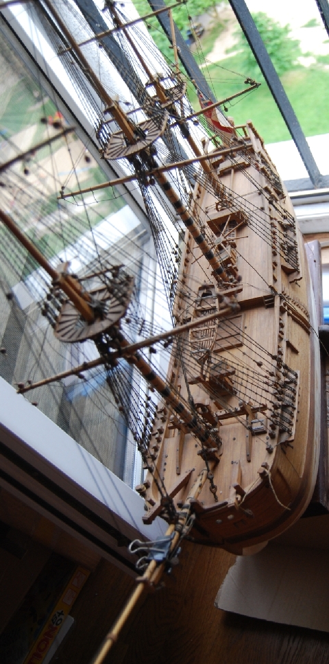 Brak uzbrojenia i olinowania górnych rei , olinowania rej bukszprytu i olinowań kierunkowych rej, malowanie dna do poprawki , gdzieś mam kotwice, skończyły się bloczki. Detale typu pourywane linki odklejony zawias steru itp , naprawione.