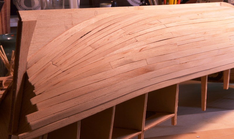 Patrząc od stępki, w żadnym wypadku nie ciągnijcie pierwszych listewek za daleko w stronę stewy rufowej. Te listewki im będą krótsze tym lepiej dla nas.