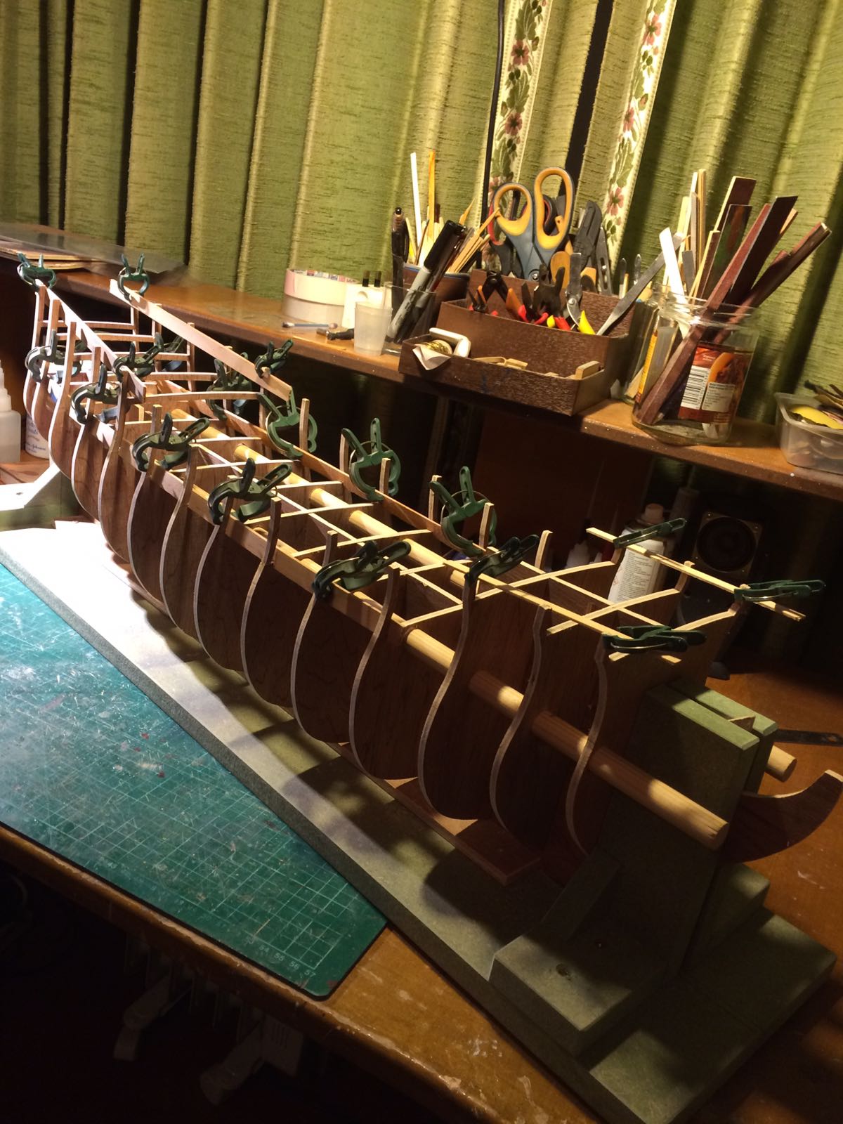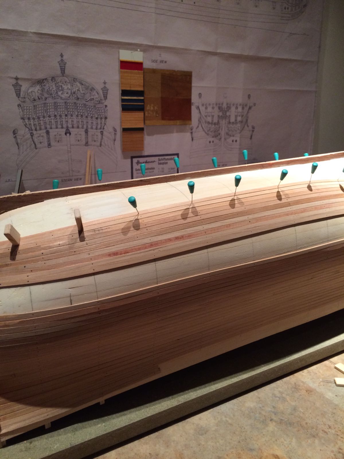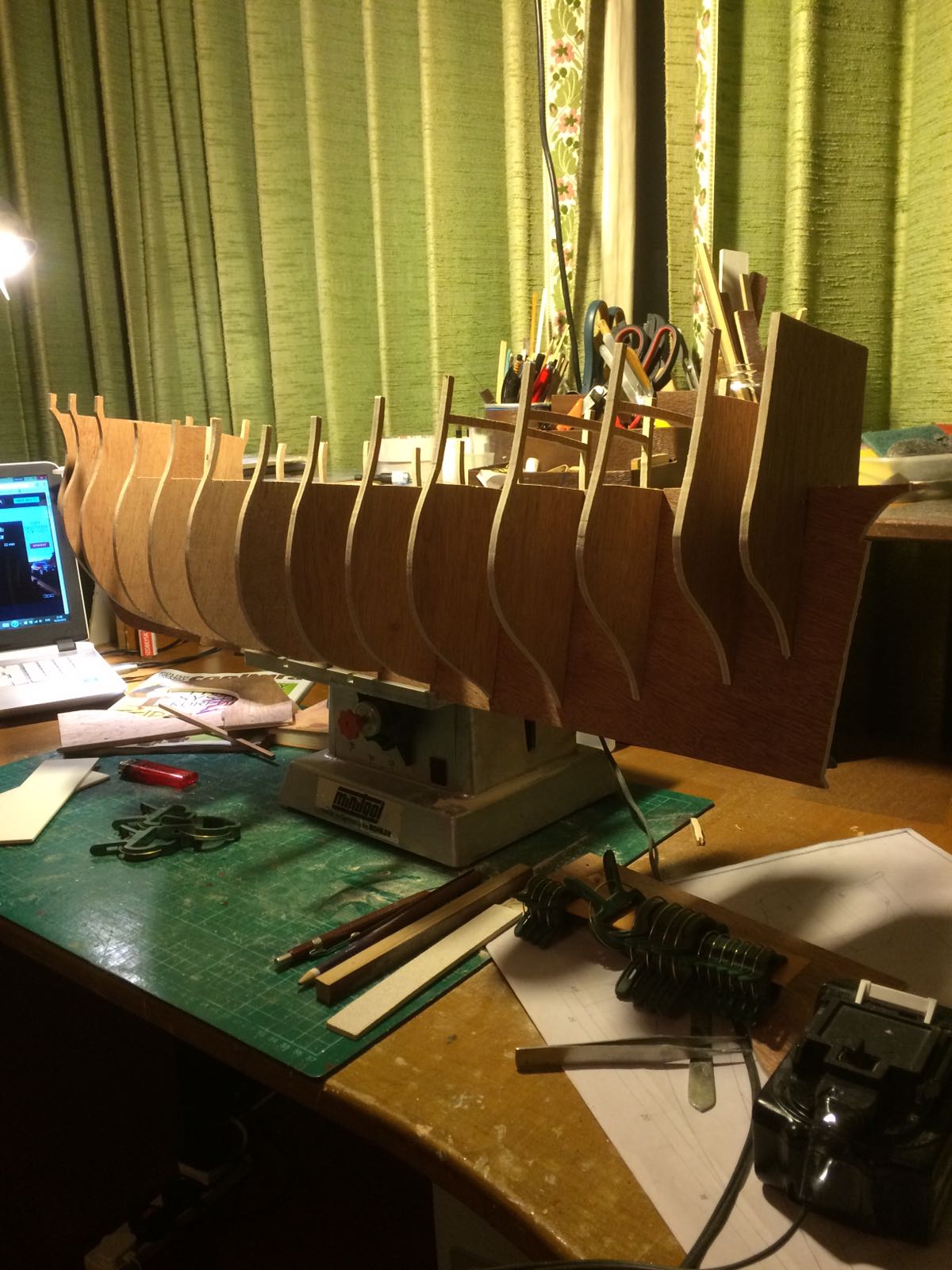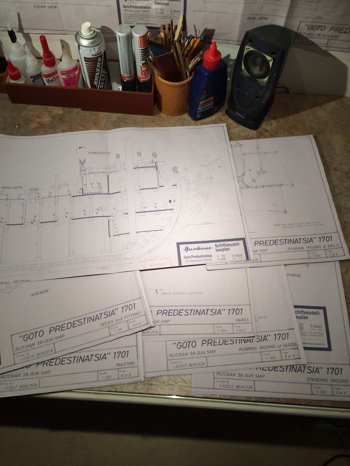 Mając Plany Modelarskie nr 145 z 1988r. planowałem, że kiedyś zbuduję ten żaglowiec. Po ich przeanalizowaniu doszedłem do wniosku, że mnie jednak nie zadowalają (brak szczegółów). Zakupiłem plany z wyd. Harhaus. W trakcie budowy będę opierał się właśnie na nich oraz na znalezionych w sieci zdjęciach repliki Goto zbudowanej w 2014r. w Woroneżu. Myślę, że projekt zajmie mi 2-3 lata. Drewno użyte do budowy to olcha (pokłady i maszty) oraz czereśnia - ze względu na jej piękny kolor. Szkielet buduję metodą tradycyjną: wręgi ze sklejki 5 mm, usztywniane kołkami drewnianymi fi 15 mm. Poszycie podwójne z listewek. Do wycięcia posłużyła mi wyżynarka i stolik własnej roboty. Po sklejeniu szkieletu zabrałem się do klejenia pierwszego poszycia z lipy 7x1,5mm.