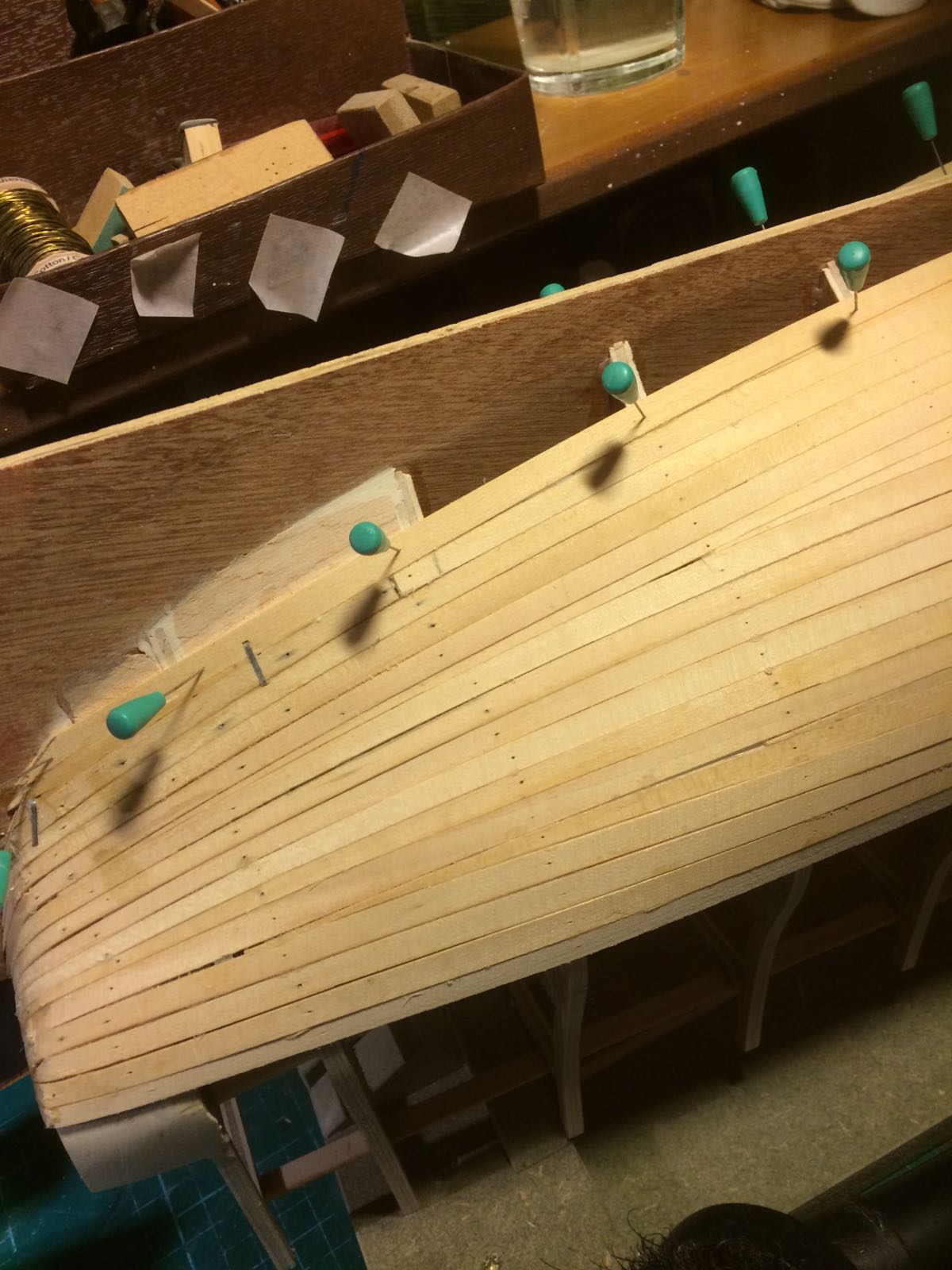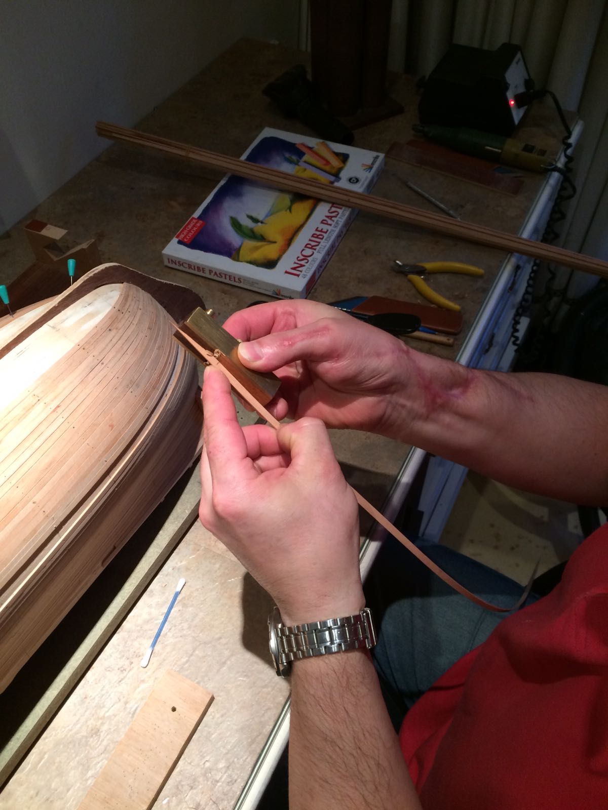 Po wycięciu odpowiednich listew z olchy 1,3 x 4,8 mm musiałem je zeszlifować z szerokości, ponieważ deski muszą być zbieżne.