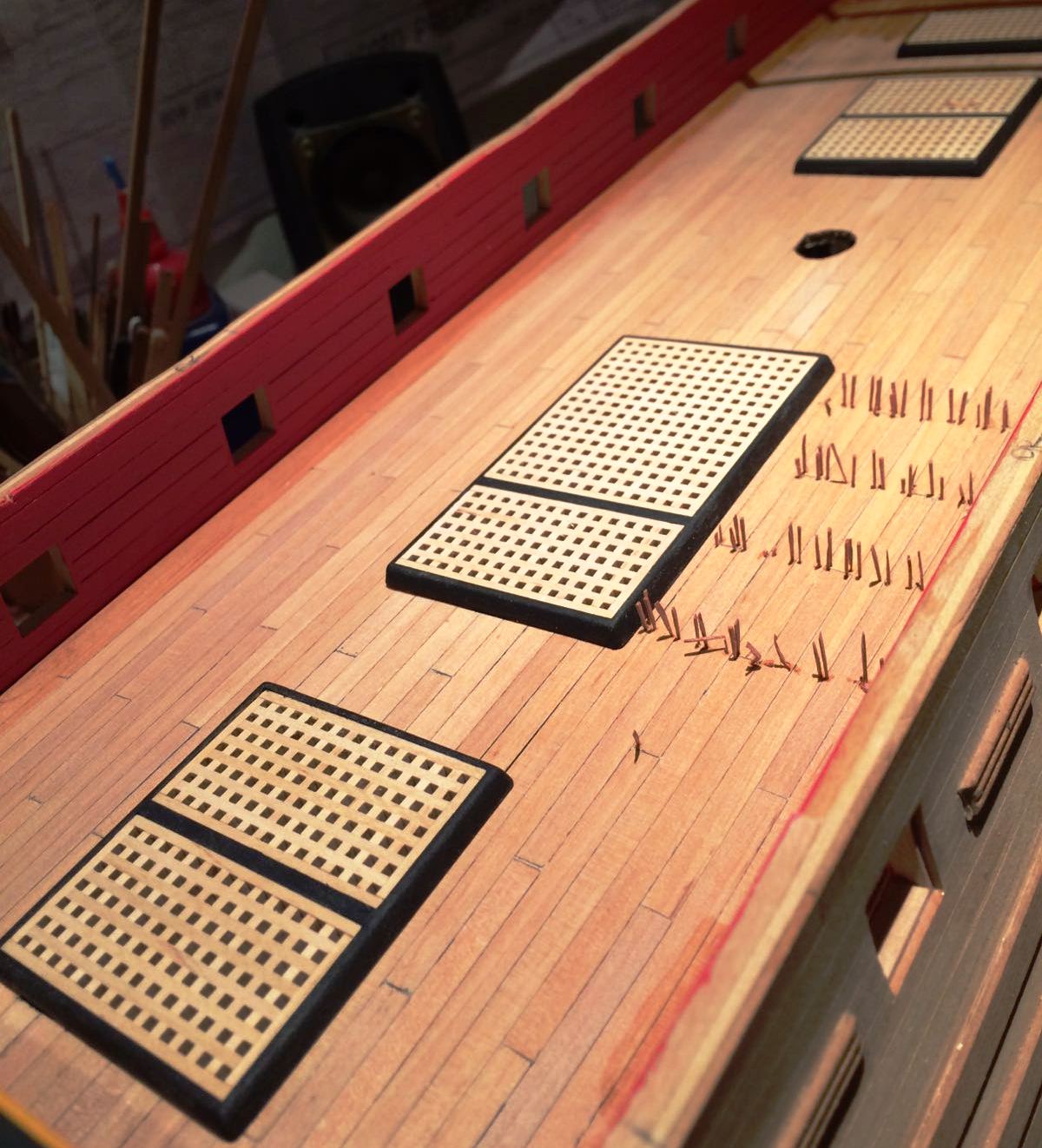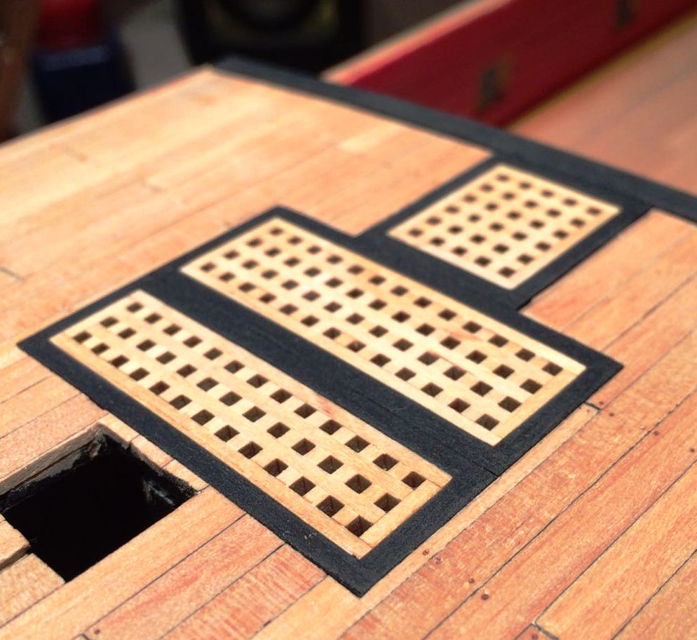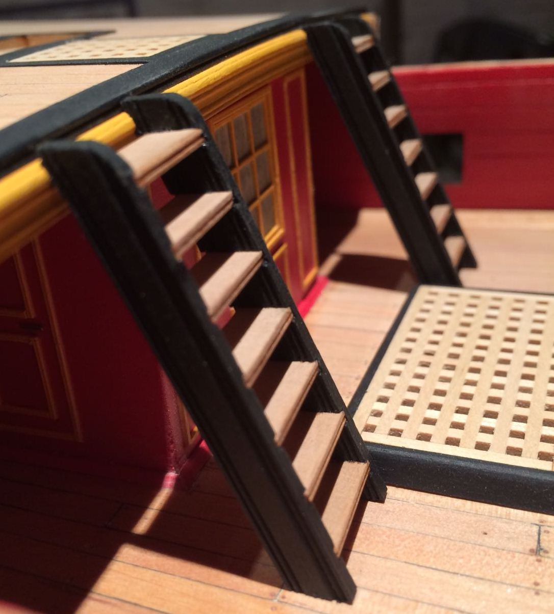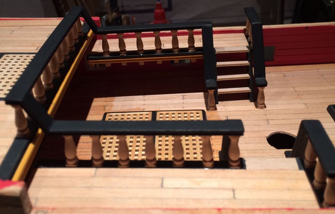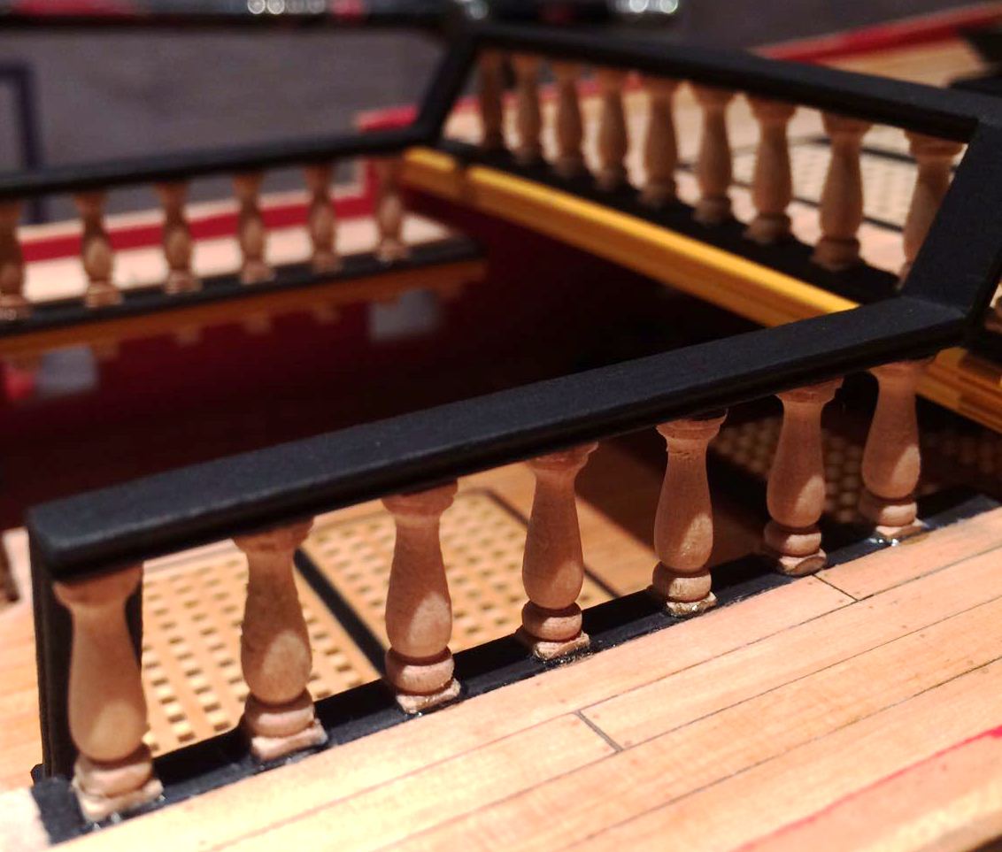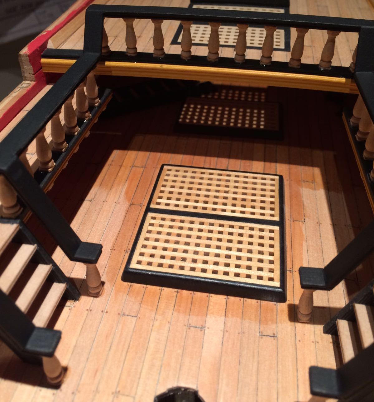 Bardzo ladnie wyszlo Ci to poszycie rufy i te gretingi. Tylko nie jestem pewien, czy w oryginale owe ramki byly czarne - farba by sie ciagle scierala pod wplywem nog marynarskich, slonej wody i swiatla slonecznego.