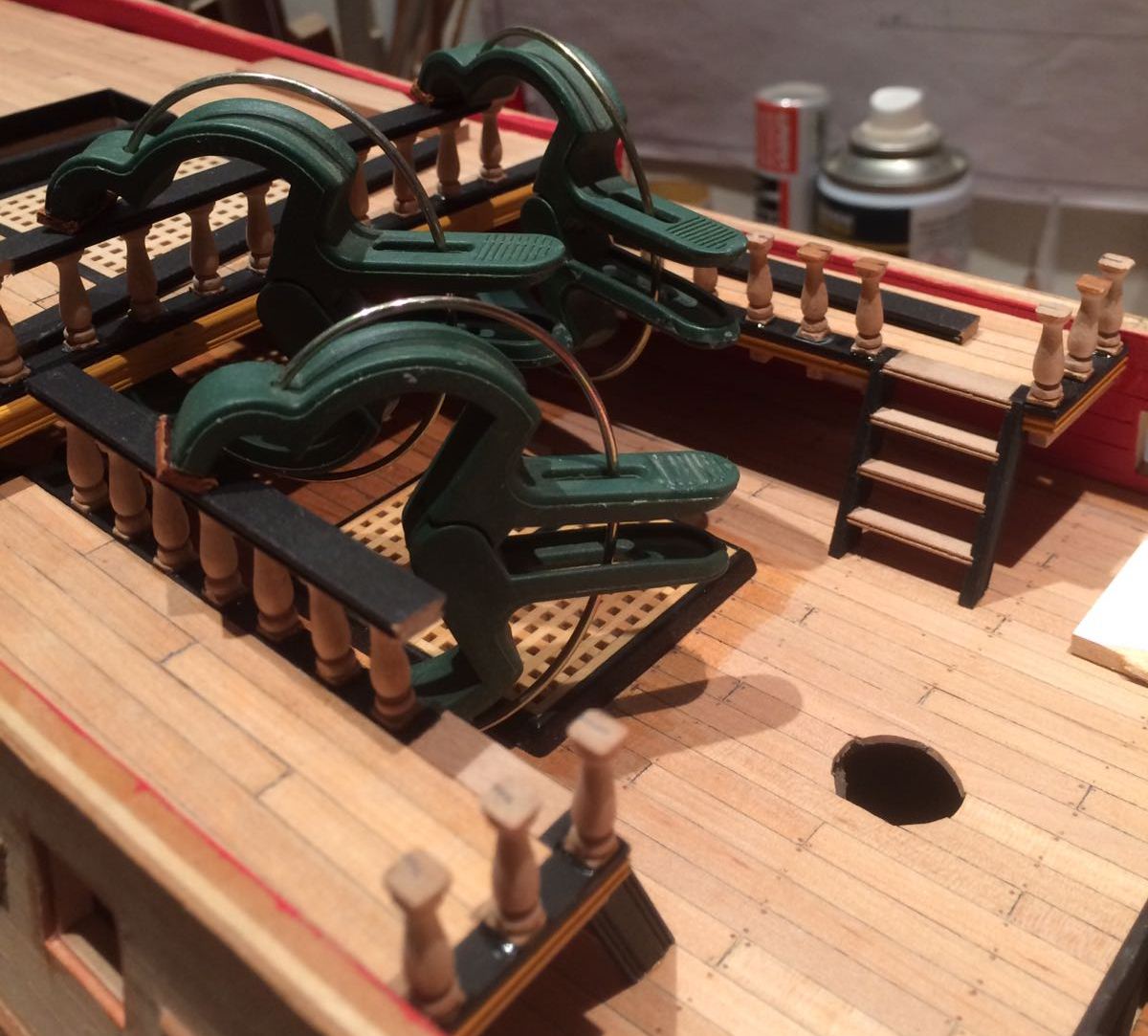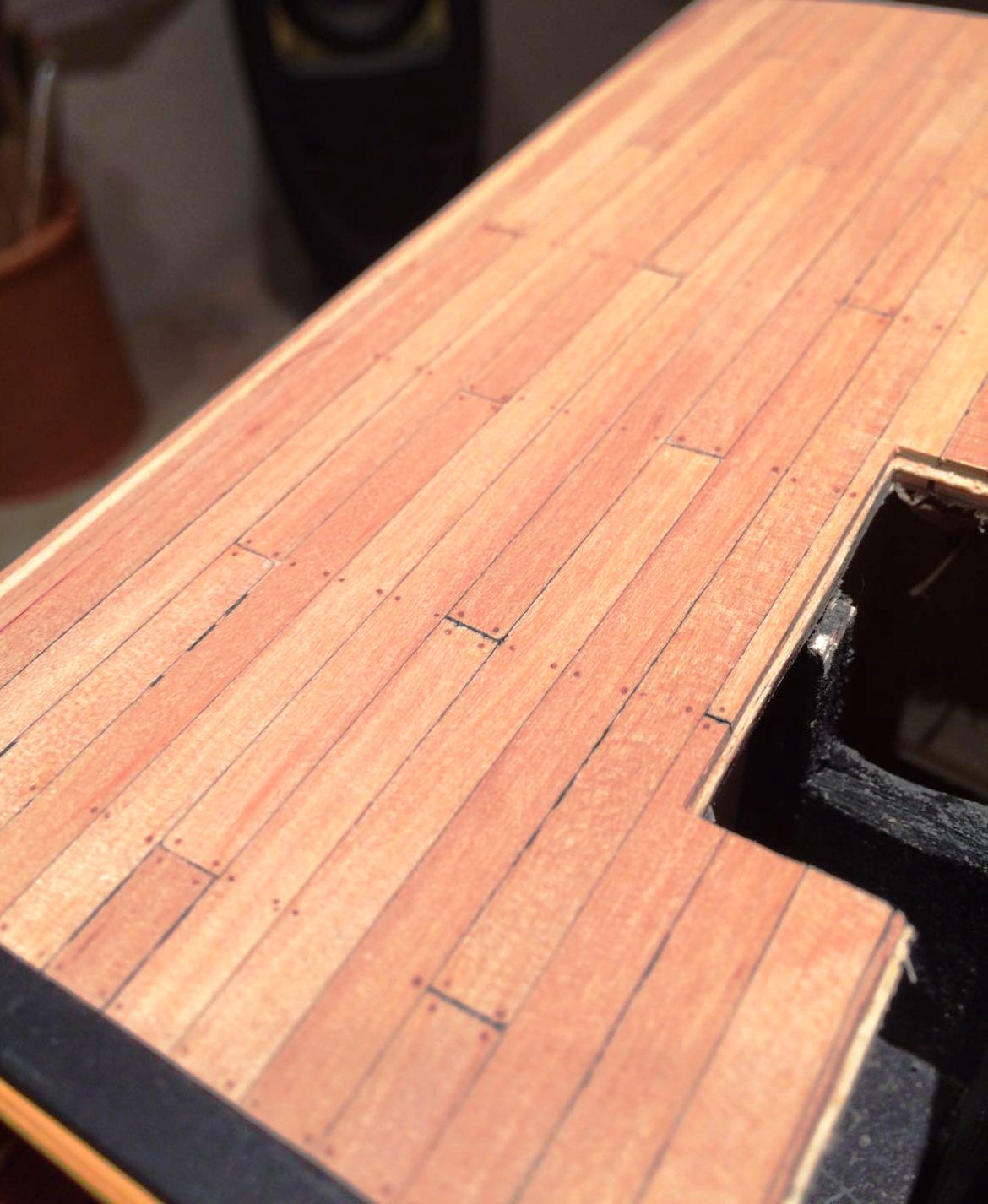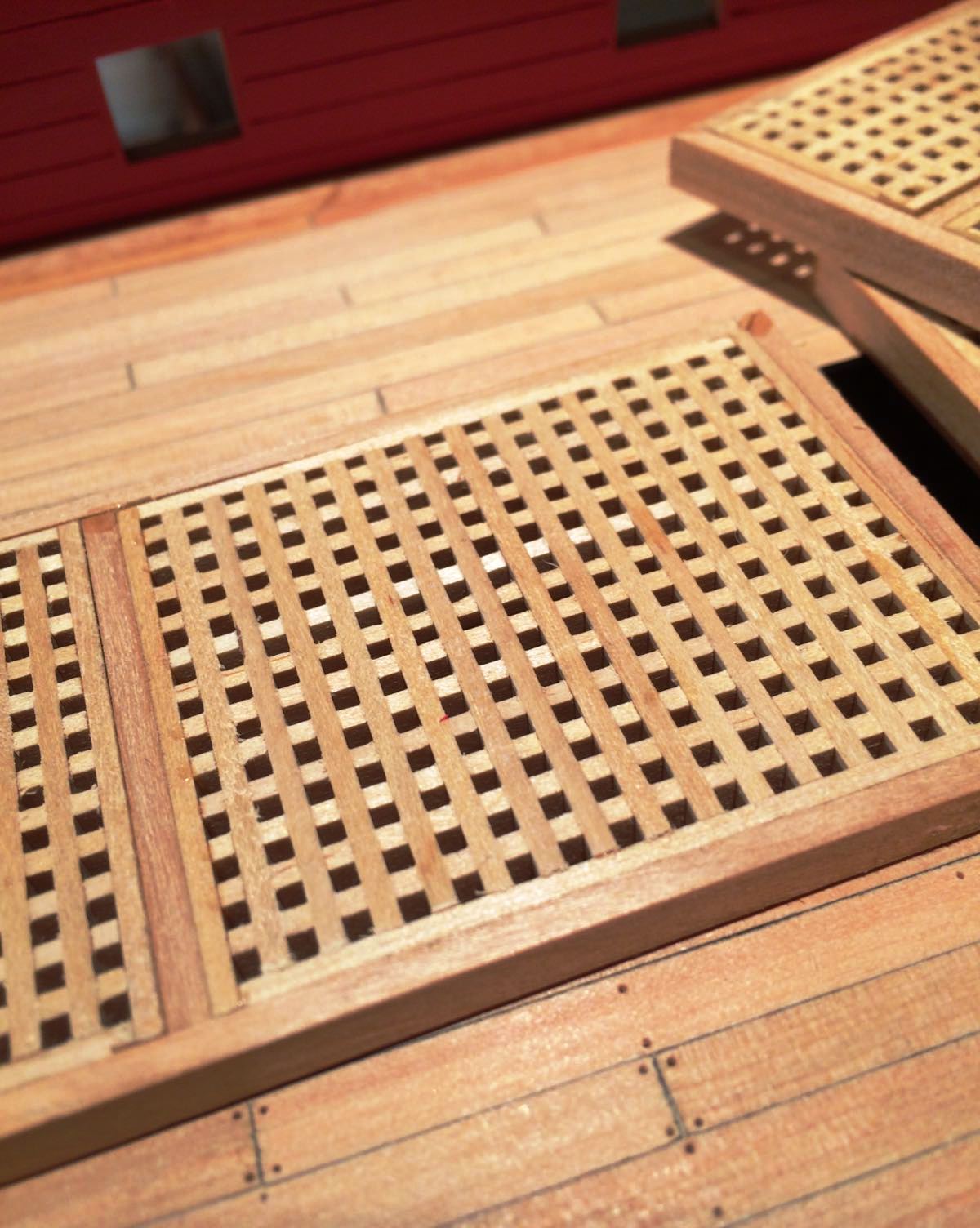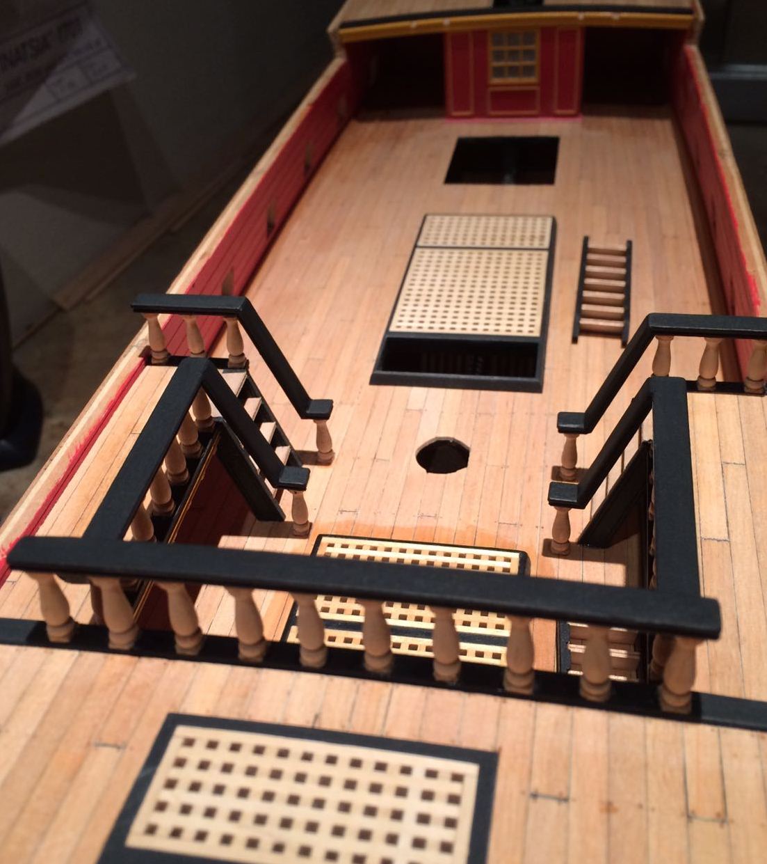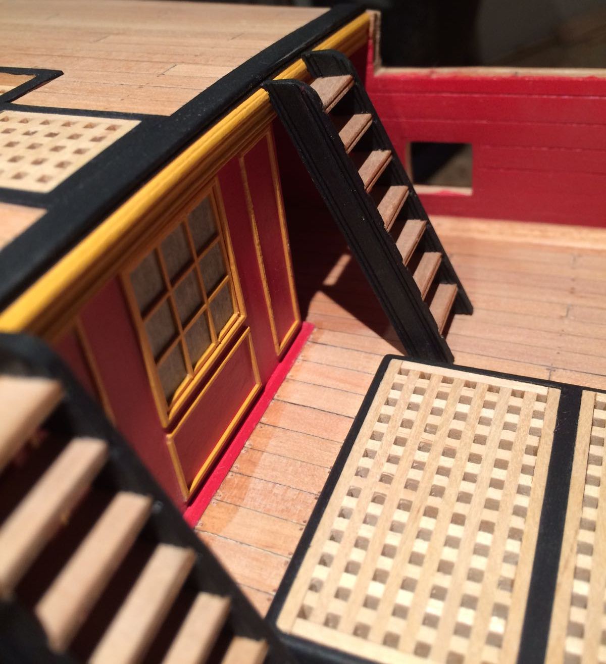 Bardzo ladnie wyszlo Ci to poszycie rufy i te gretingi. Tylko nie jestem pewien, czy w oryginale owe ramki byly czarne - farba by sie ciagle scierala pod wplywem nog marynarskich, slonej wody i swiatla slonecznego.