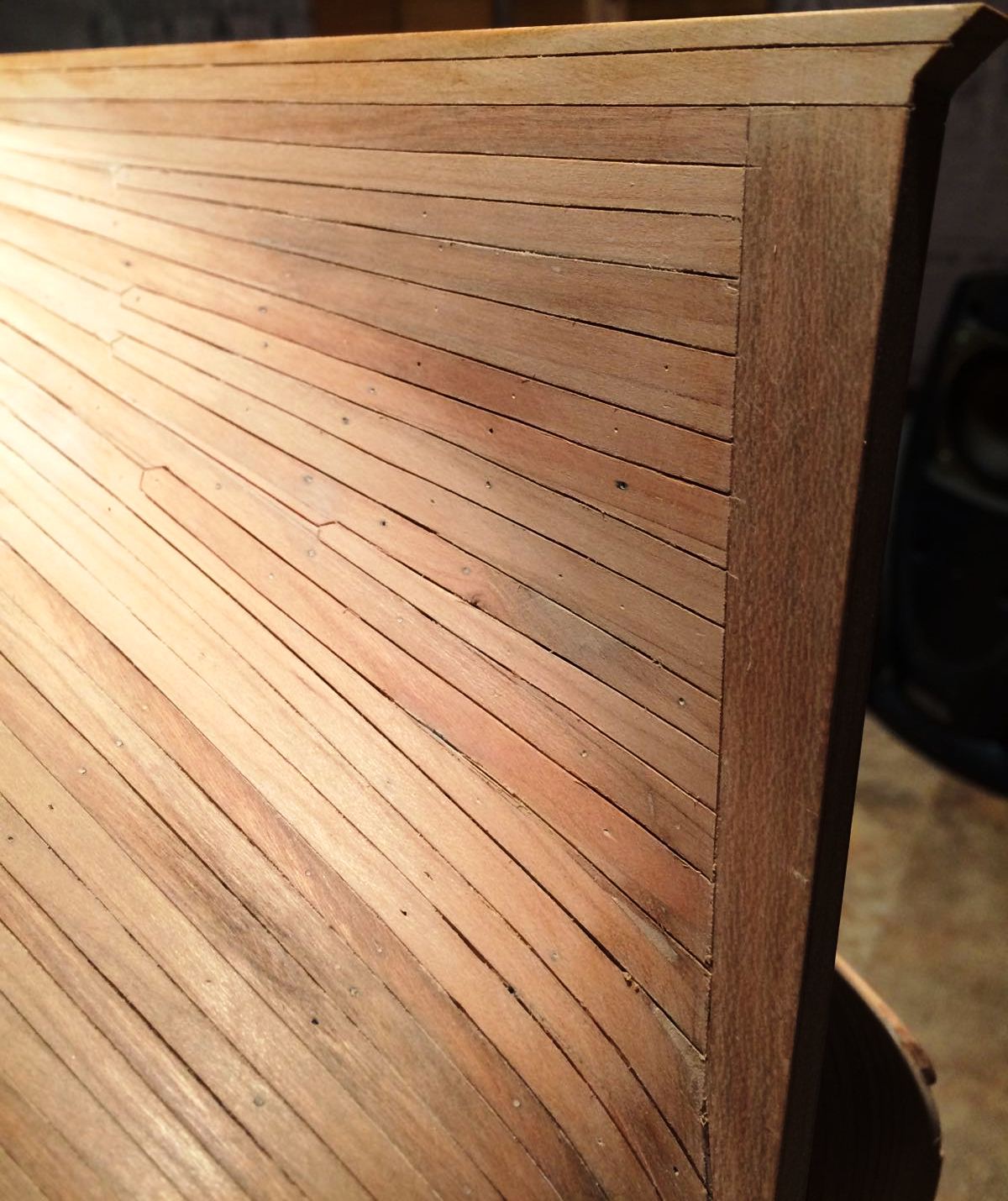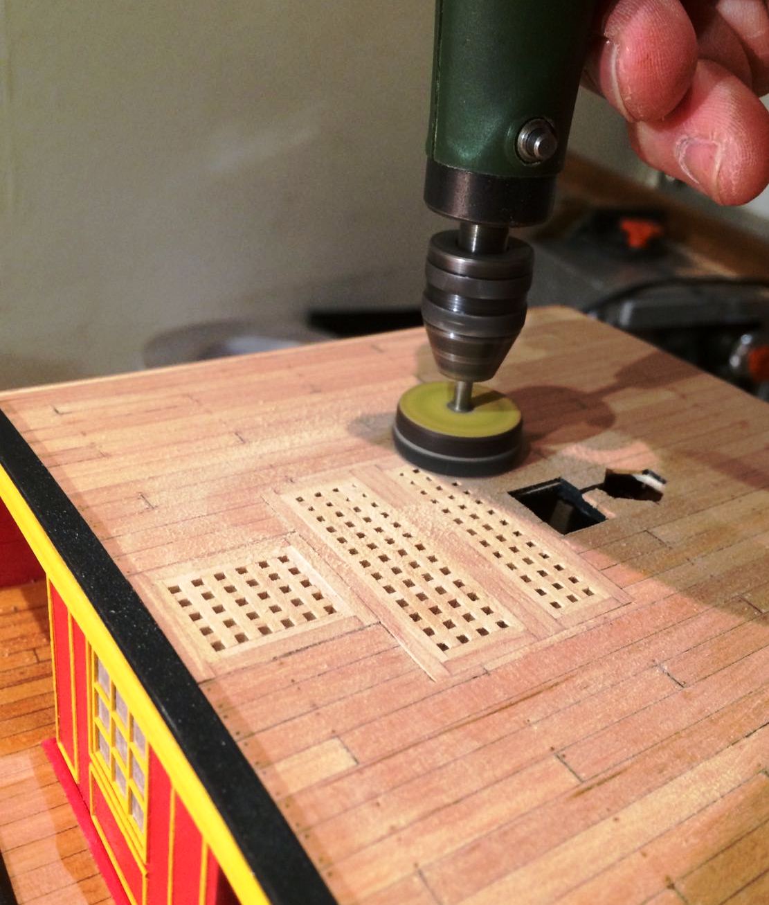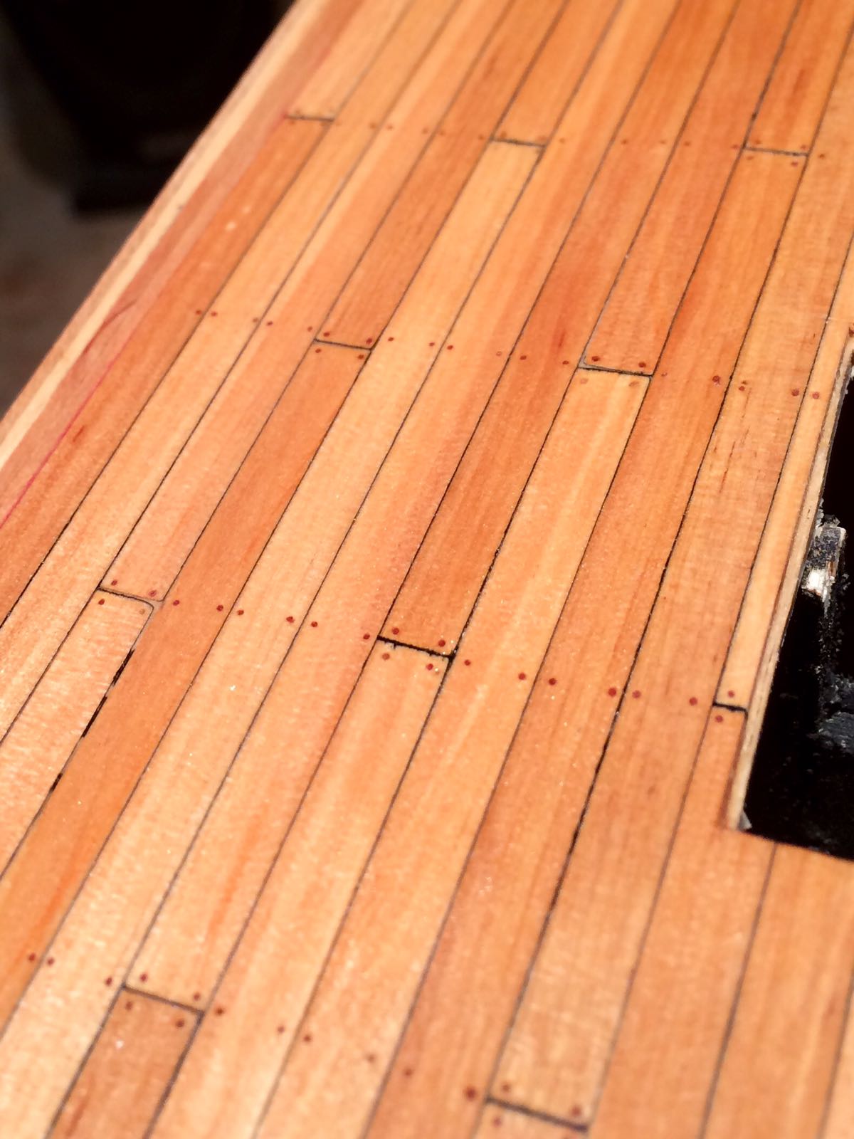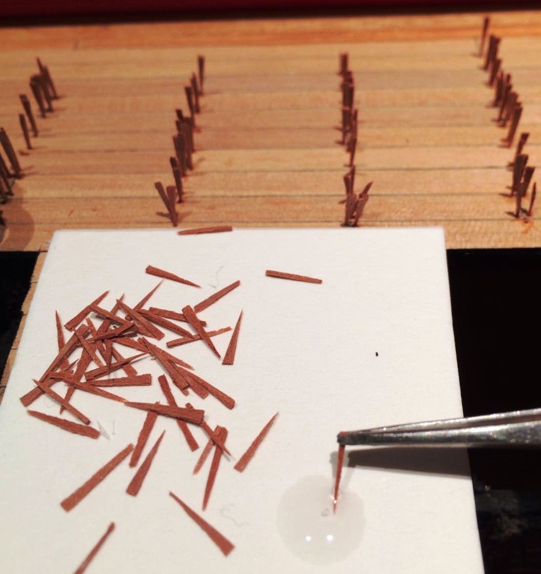 Teraz o kołkowaniu pokładu. W tym modelu postanowiłem zrobić wyjątkowo cienkie kołki. Użyłem wiertła najcieńsze jakie miałem.