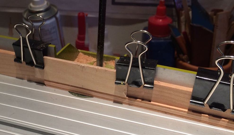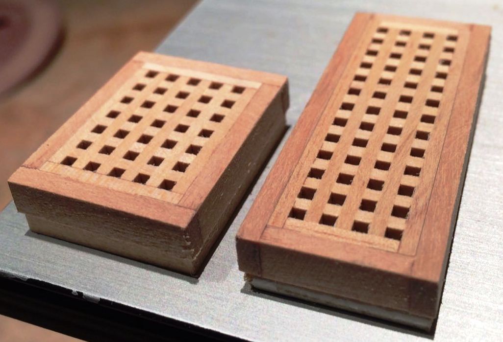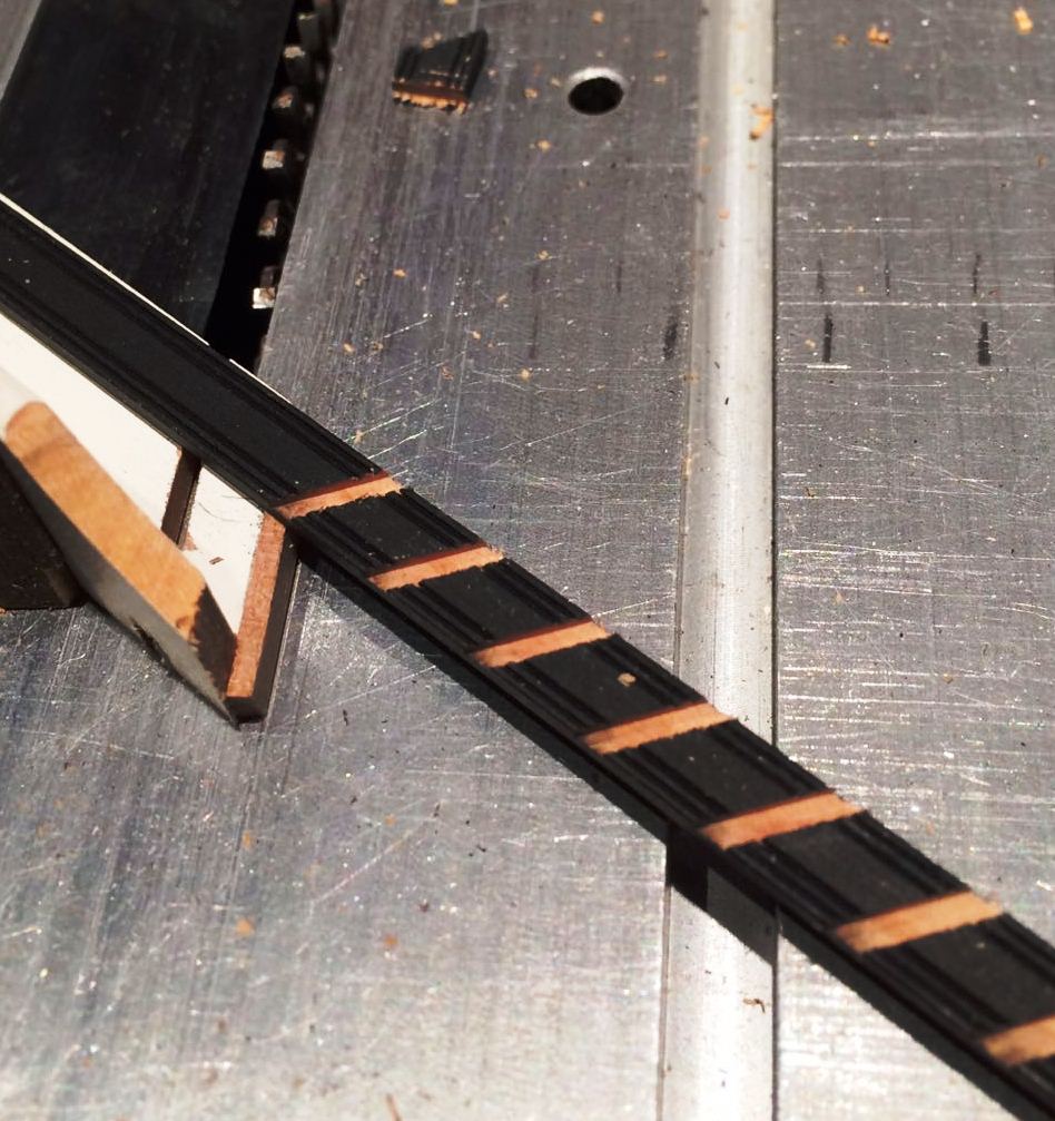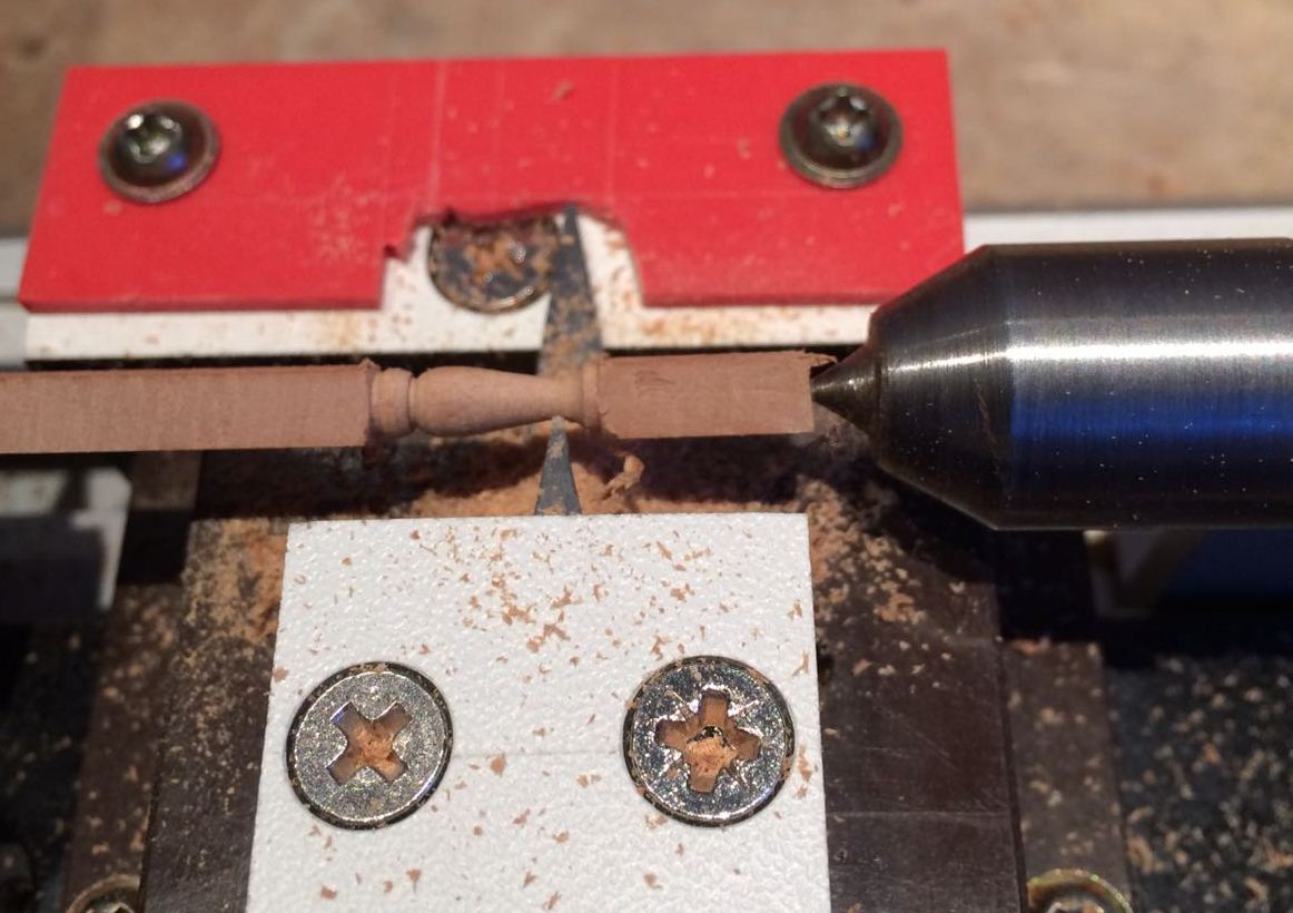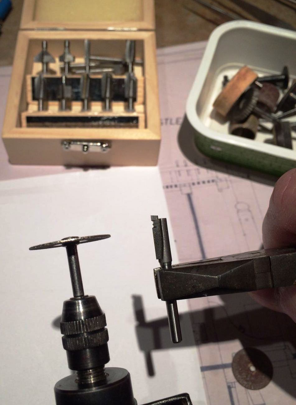 Liswy o przekroju 1,8 x 6 i 1,5 x 5,8 postanowiłem wzbogacić o frezy ozdobne, wzorując się na zdjęciach repliki. W tym celu posłużyłem się Proxxonem MP 400. Frezy kształtowe naciąłem tarczą diamentową.