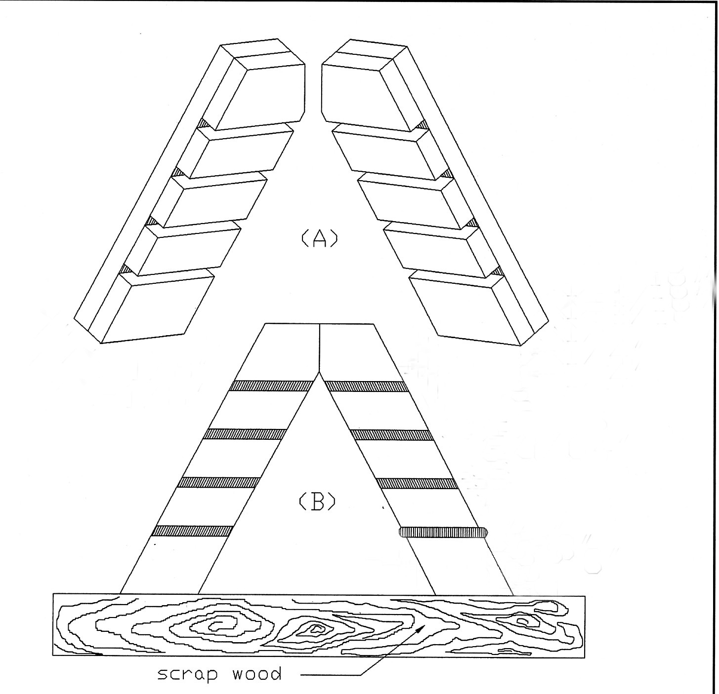 2- Teraz sklejasz tymczasowo bocznice nas ksztalt litery A pod katem ktory jest dwukrotnie wiekszy od kata nachylenia Twych schodow (zmierz to na planie). Sklejasz tymczasowo obie bocznice, tak u gory litery A, jak i u dolu - tu do dodatkowej listewki - jak pokazane na rys. B ("scrap wood"). W rezultacie otrzymasz trojkat.