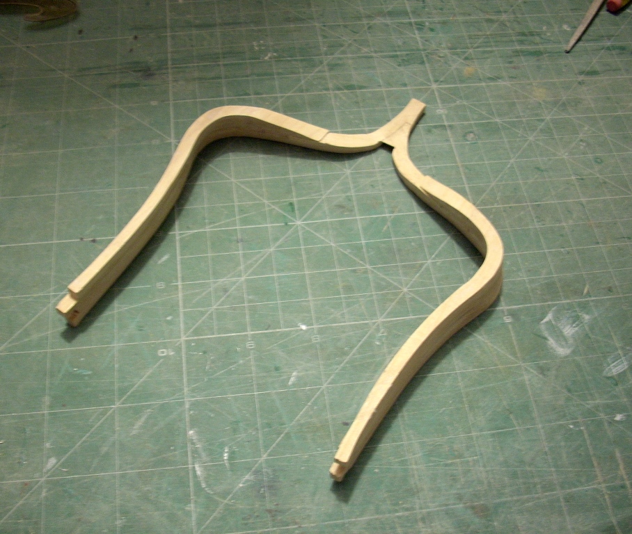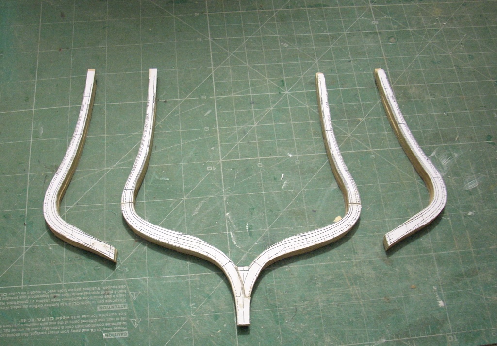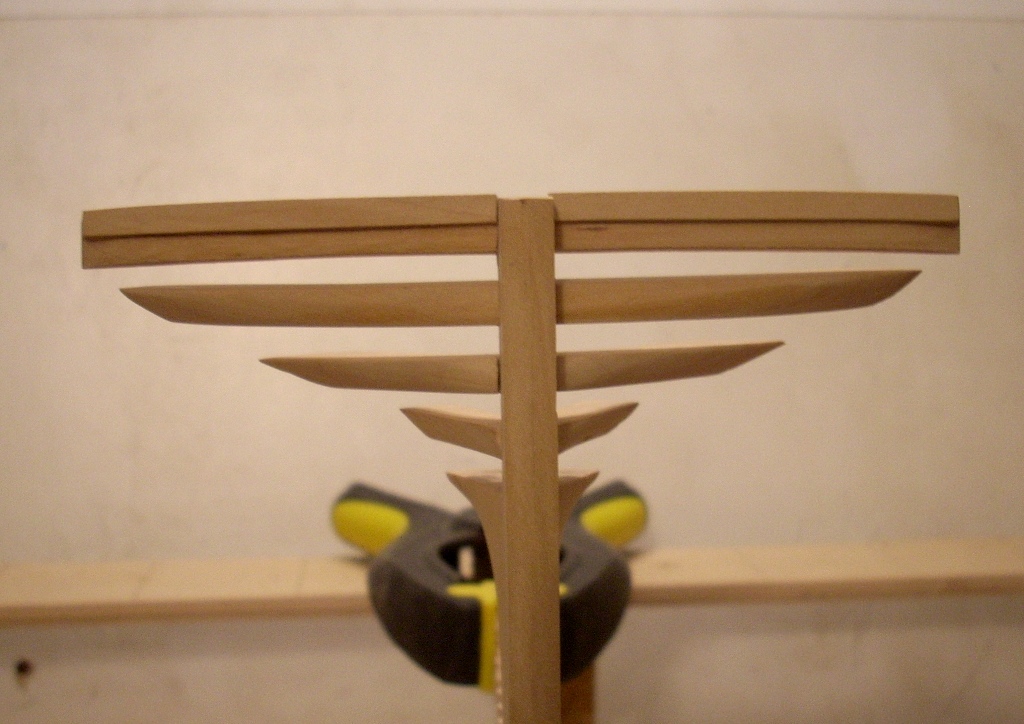 A nie wygodniej by było wyciąć dwie różne wręgi ( jak na rysunku przednia i tylnia ) i sklejać na planie i wtedy miejsca styku tych wręg pokazują Ci dokąd masz szlifować . Jest to wygodniejsze , moim zdaniem , i dokładniejsze . Nie trzeba tyle rezać tego drewna .