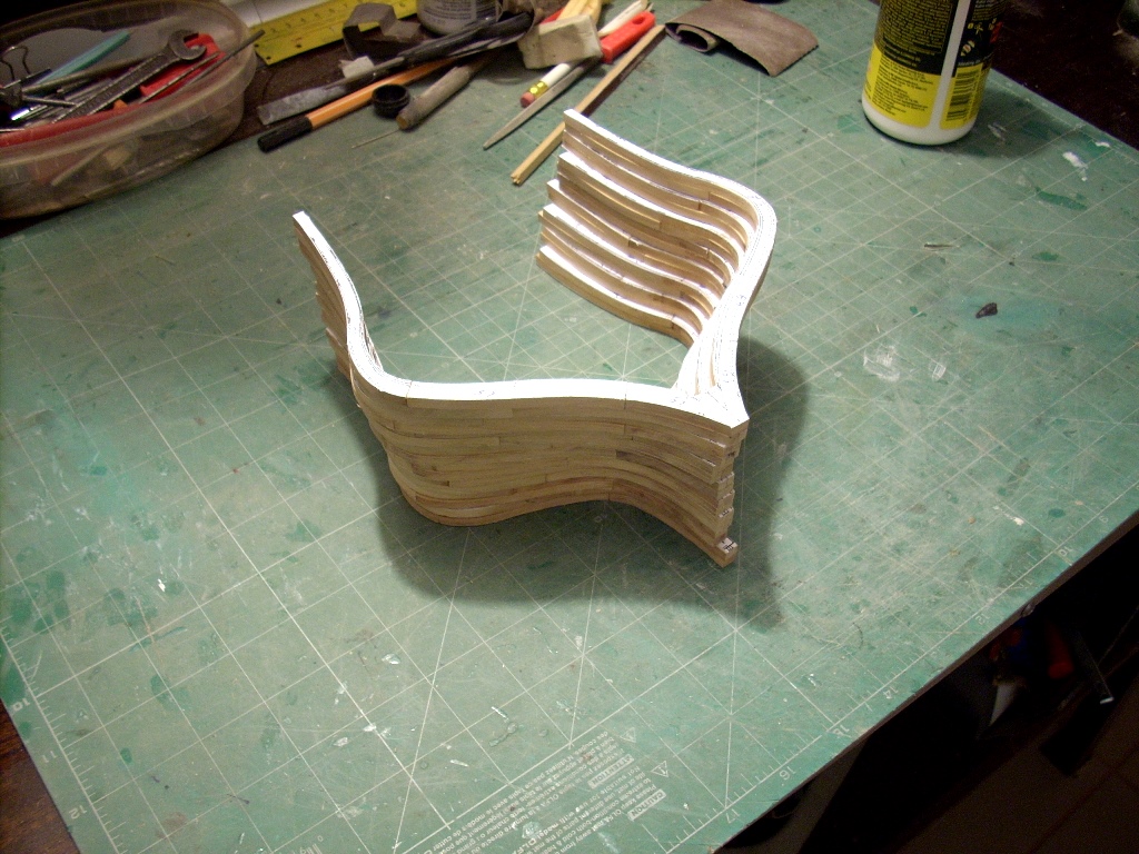 Na początku były deseczki :D , później przez tydzień naklejanie pociętych wręg a następny tydzień wycinanie. 56 szt każda po 12 lub 14 elementów czyli około 680 kawałków . Teraz zostało to przeszlifować po zewnętrznym obrysie i pokleić co zacząłem robić jak widać .