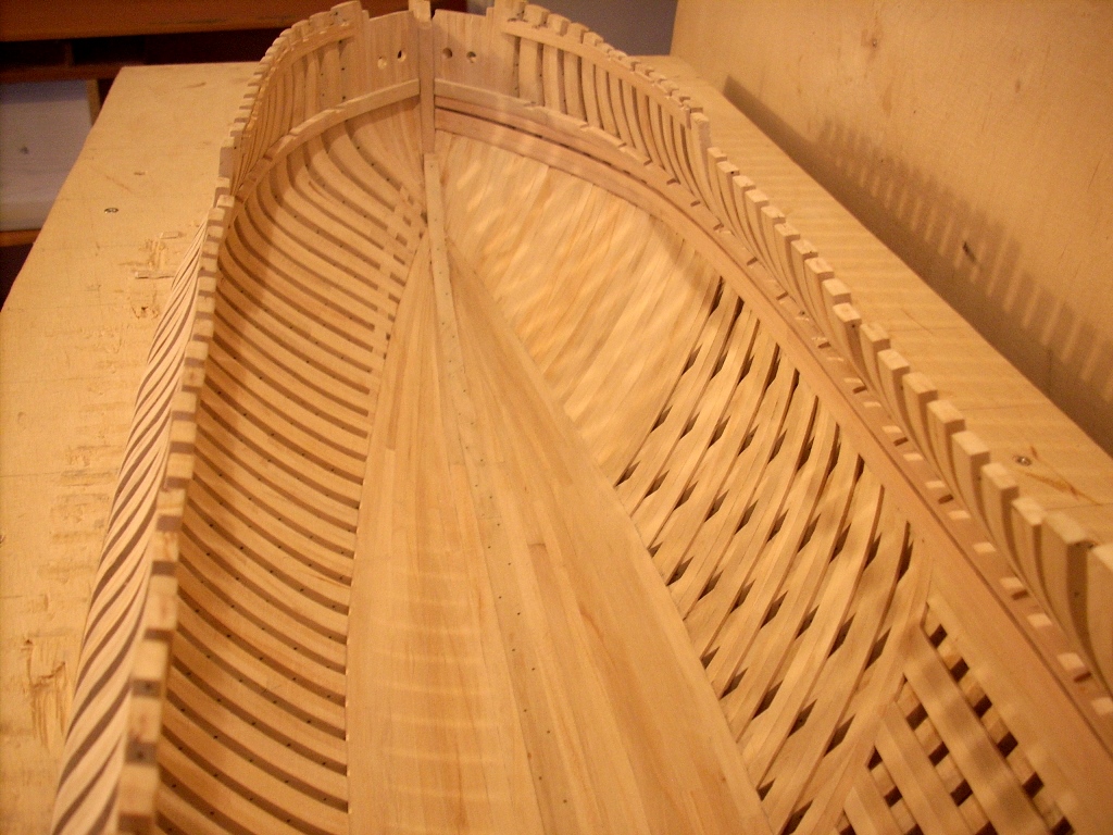 Prace nad poszyciem wewnętrznym trwają . Troszkę to schodzi bo każda deska musi być wygięta i ściśnięta do wręg ze względu na ich kształt i trzeba odczekać aż złapie i wyschnie klej.